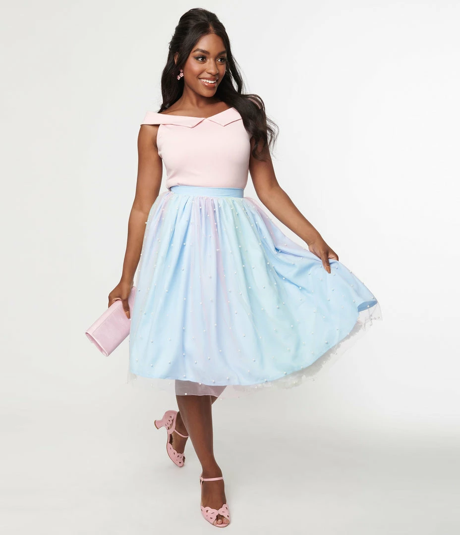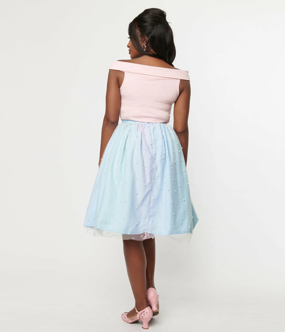 This chic swing skirt is crafted in a lightweight pastel ombre rainbow mesh that dances with faux pearls over a light blue lining. The banded waist is cinched with a back zipper and button and complete with side pockets.