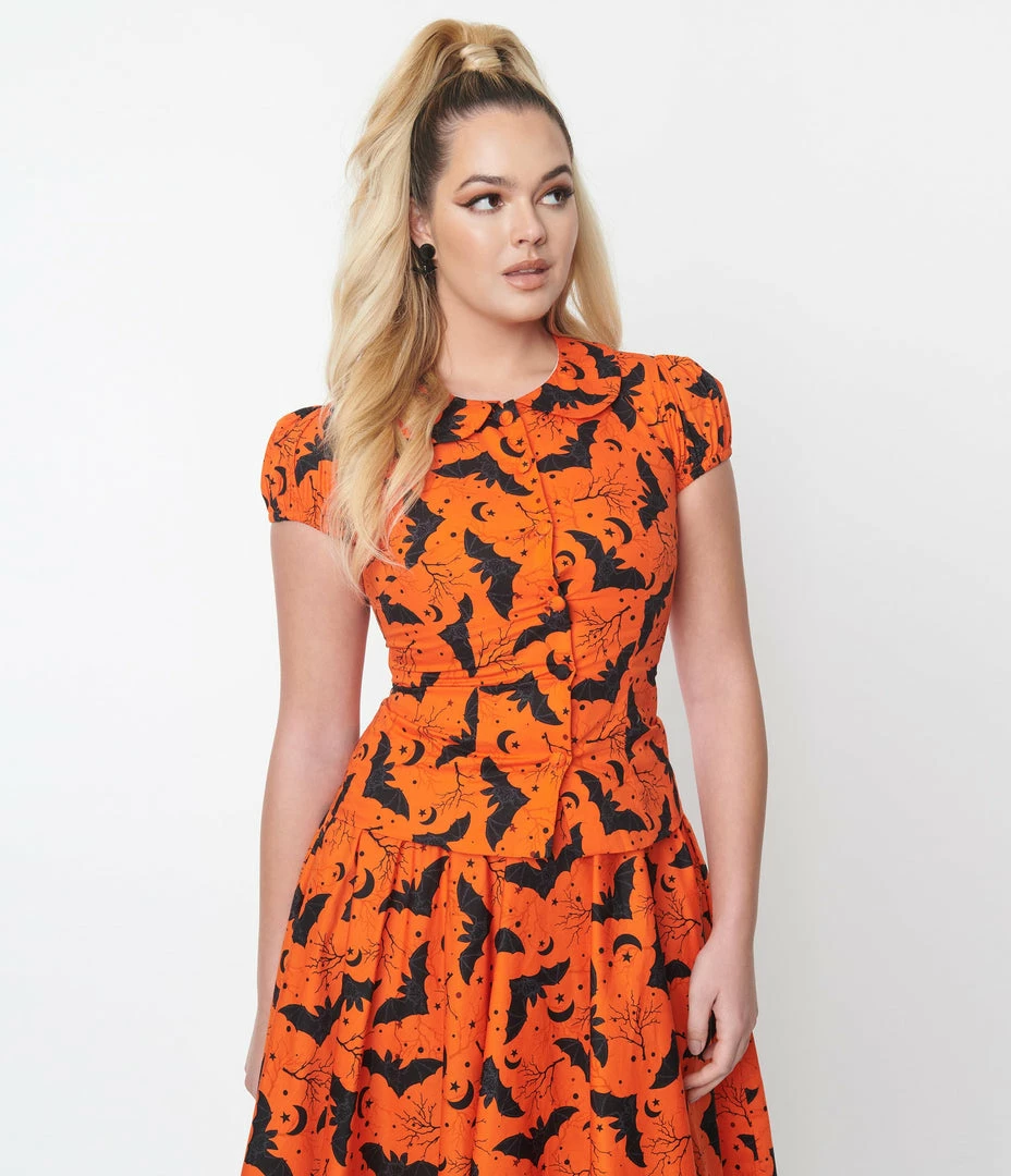 It’s ok to be a little batty! This adorable blouse boasts a festive black bats, crescent moons, and stars presents throughout the orange woven fabric. The button up front of this darted piece leads to a charming Peter Pan collar while the sweet cap sleeves feature elastic for a comfortable accent!