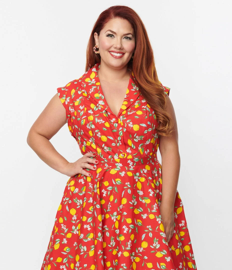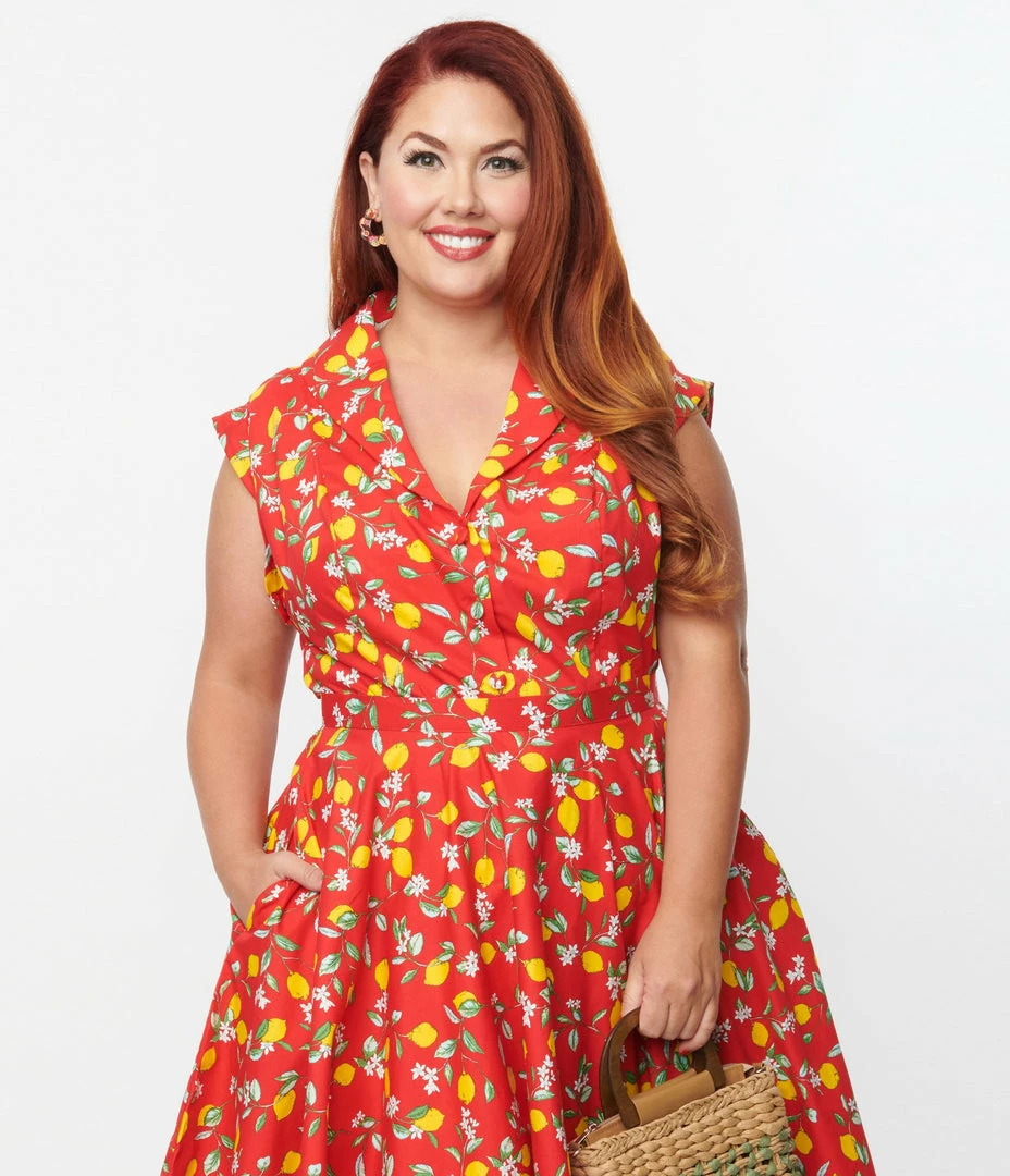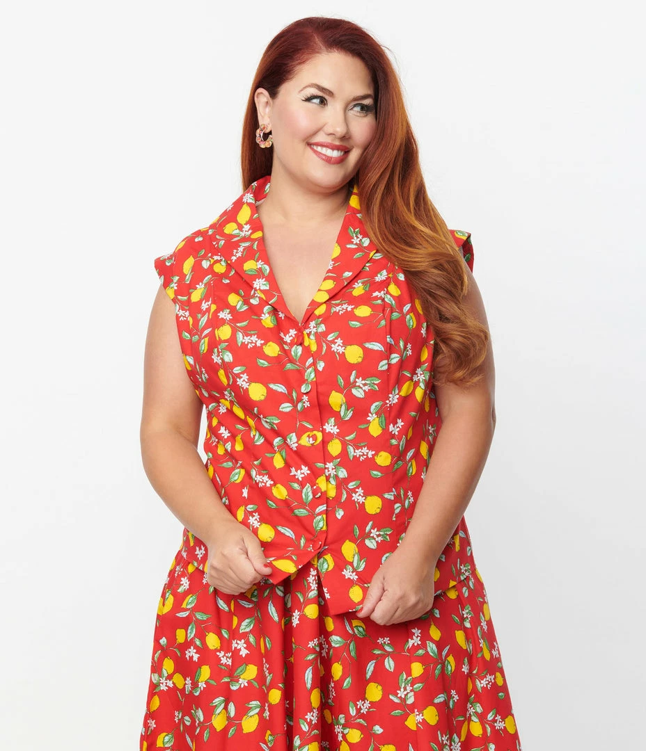 Promo 💯 Magnolia Place Plus Size 1950s Red & Lemon Print Tamara Top Sale 🔥
