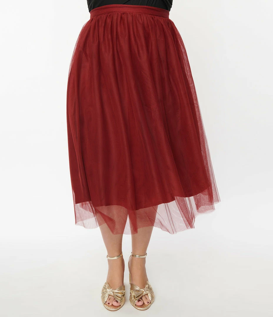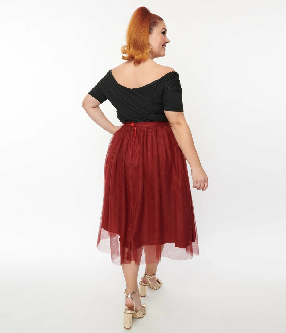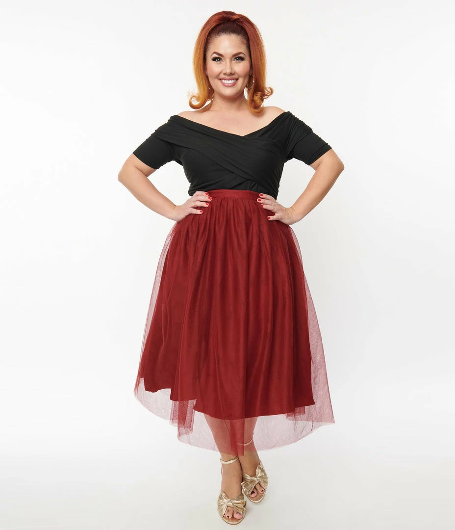This lovely plus size skirt from Magnolia Park is crafted in a soft deep red tulle. The banded waistband nips in your form while the straight hem drops past your knees!