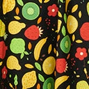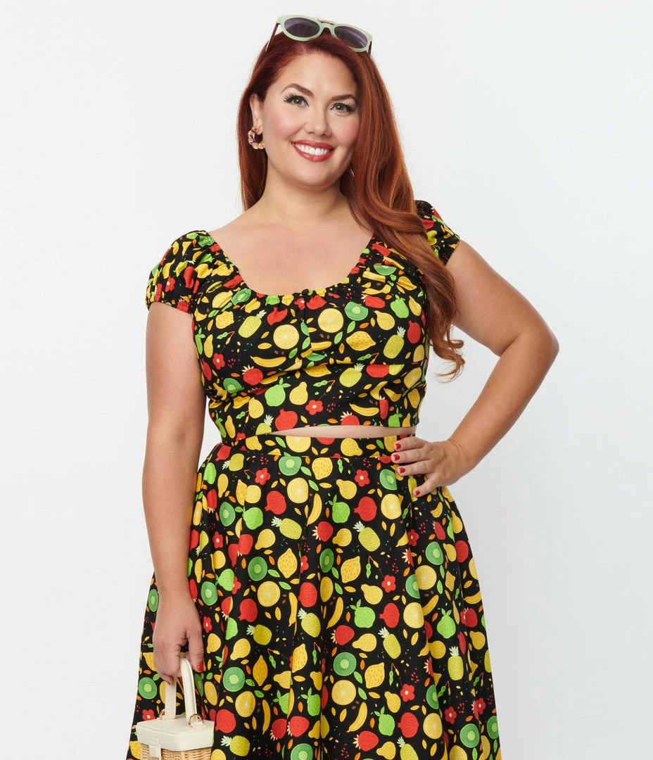 This refreshing plus size crop top is crafted in cotton that dances with a sweet bounty of pineapples, strawberries, kiwis, pears, and lemons throughout black backdrop. Outfitted with with elastic Bardot sleeves and a back zipper.