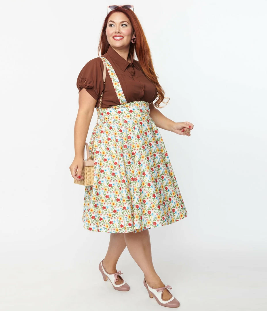 This darling pinafore plus size skirt is crafted in lightweight cotton that dances with multicolor wildflowers throughout a white backdrop. Outfitted with button adjustable straps, back zipper, and side pockets.