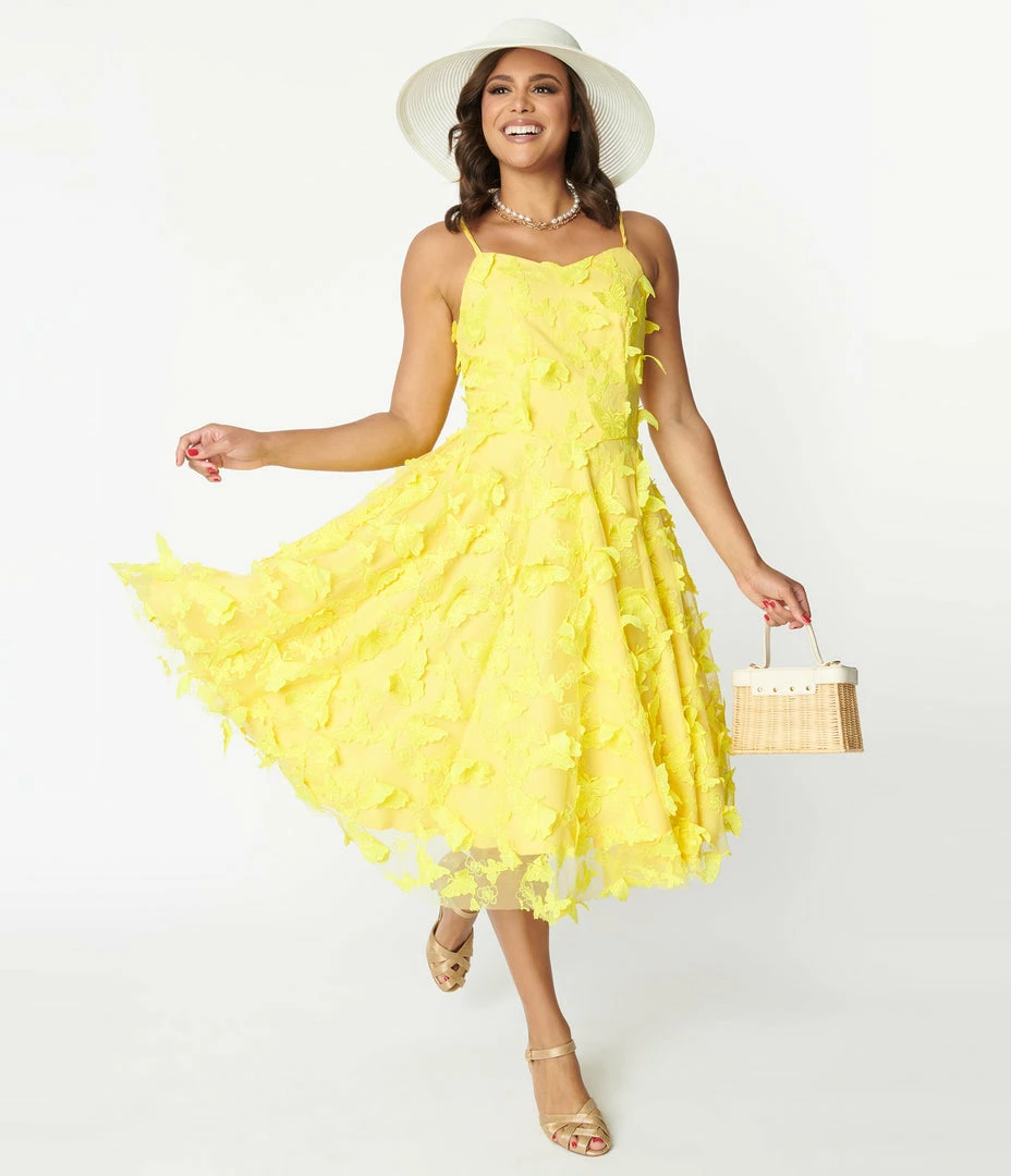 A refreshingly swing dress silhouette, crafted in a bright yellow mesh that dances with 3D butterflies, over a matching yellow lining. Outfitted with adjustable straps, and a back zipper.