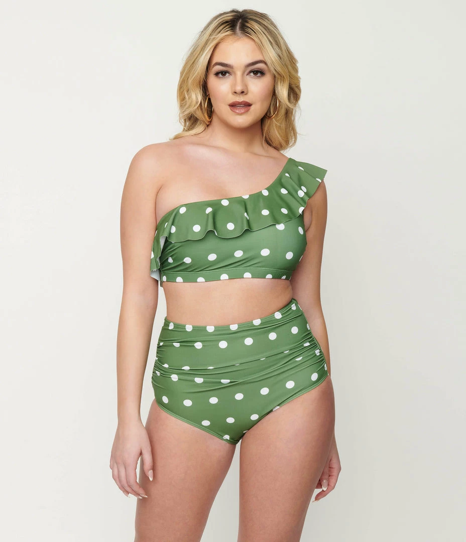 Knock them out of their sandals, dames! A bevy of white polka dots dance through a green backdrop of this playful two piece swimsuit. The one shoulder silhouette boasts gorgeous ruffled drapery while removable padding provides a subtle boost. The high waisted bikini bottoms feature side ruching and a cheeky silhouette!