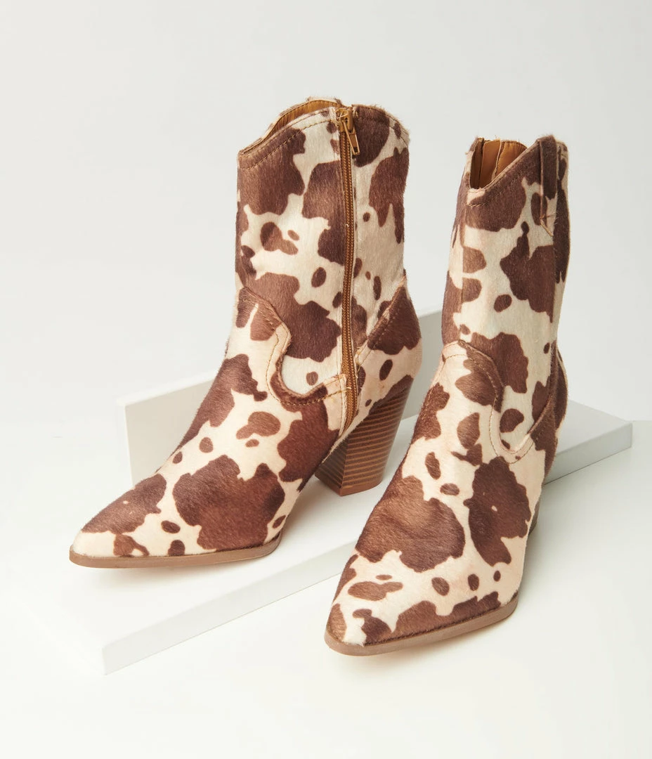 Play your wild card in these sensation boots, crafted in a faux calf hair textile that dances with a tan and cream cow print throughout the classic cowboy shape. The side zipper secured these kicks as the 3.5 inch stitched heel lends a fabulous lift!