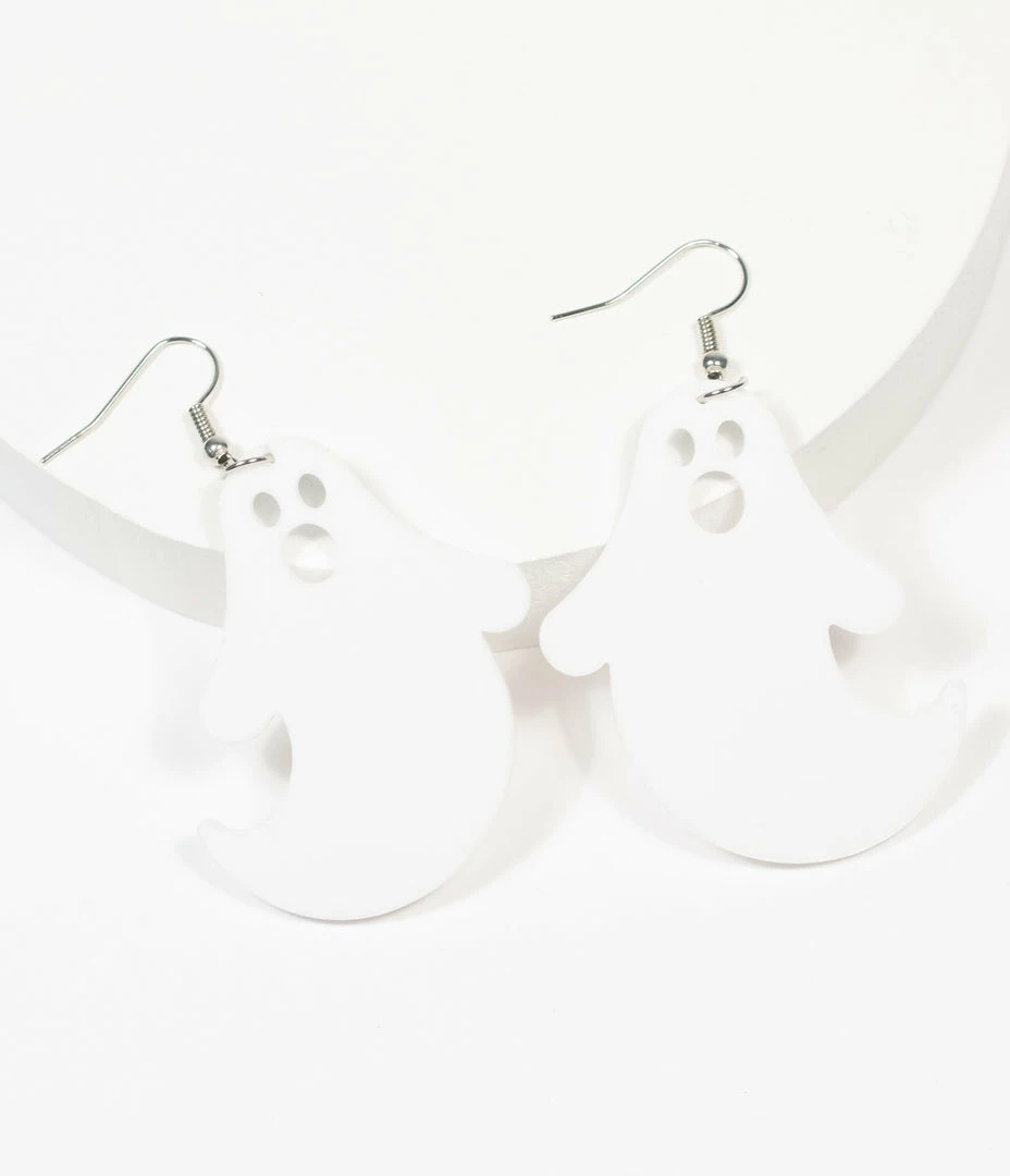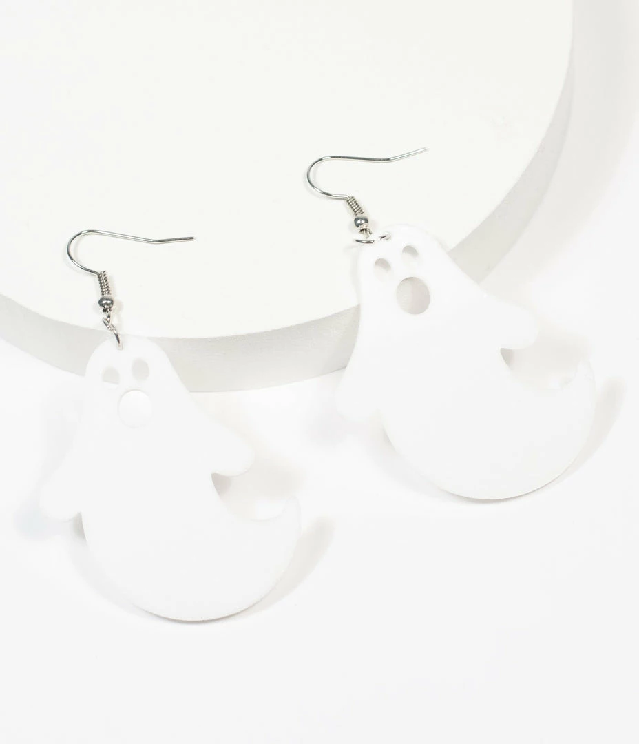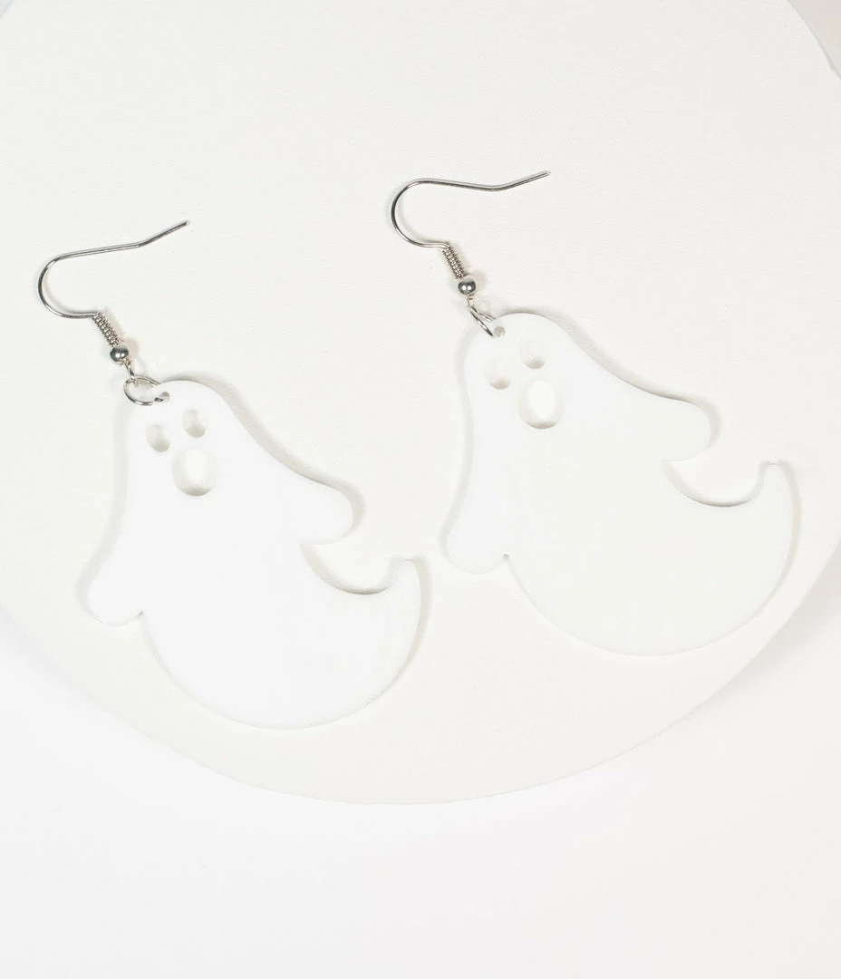 Putting the boo in fab-boo-lous, darling! These chilling drop earrings boast a pair of white ghosts, crafted in lightweight acrylic. Secured with a hook back!