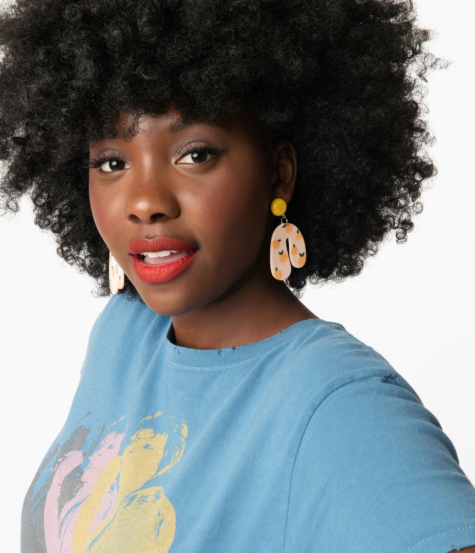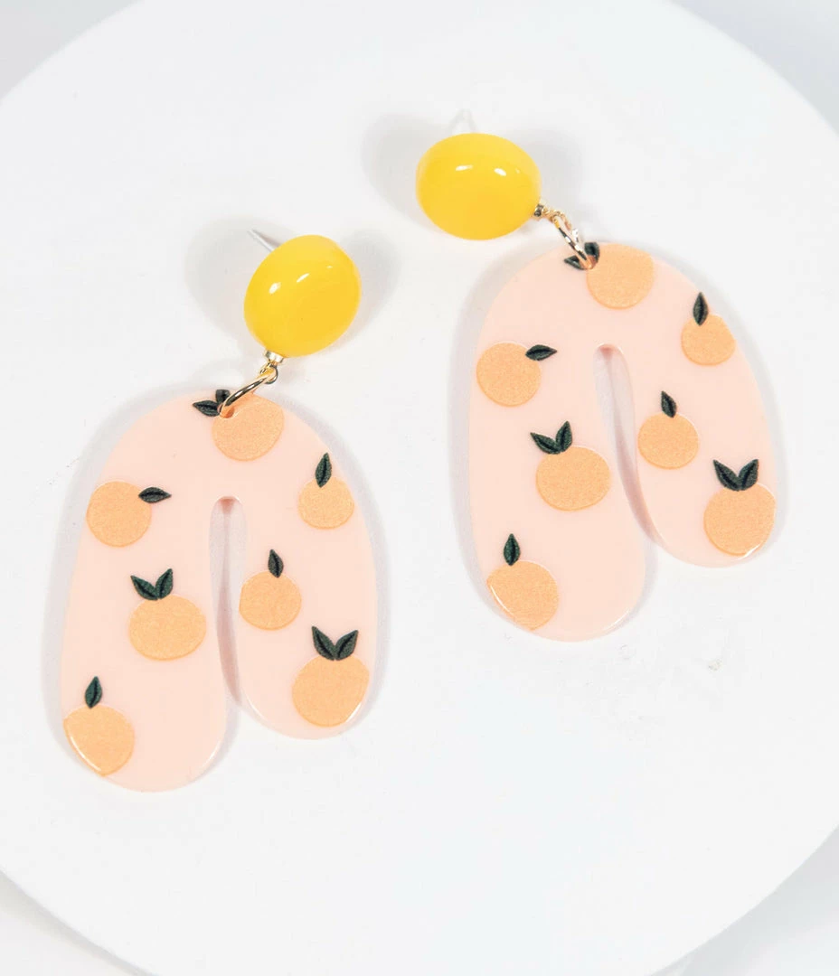 Sweet as summer! These earrings feature a bevy of oranges dancing around in the pink acrylic background that drop from yellow buttons. Secured with post backs!