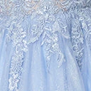 This enchanting gown is crafted in a shimmering light blue chiffon, with a floral embroidered bodice, secured with floral straps, and a back zipper. The dazzling full length skirt dances over a matching light blue lining and is accented with floral embroidery along the waist.