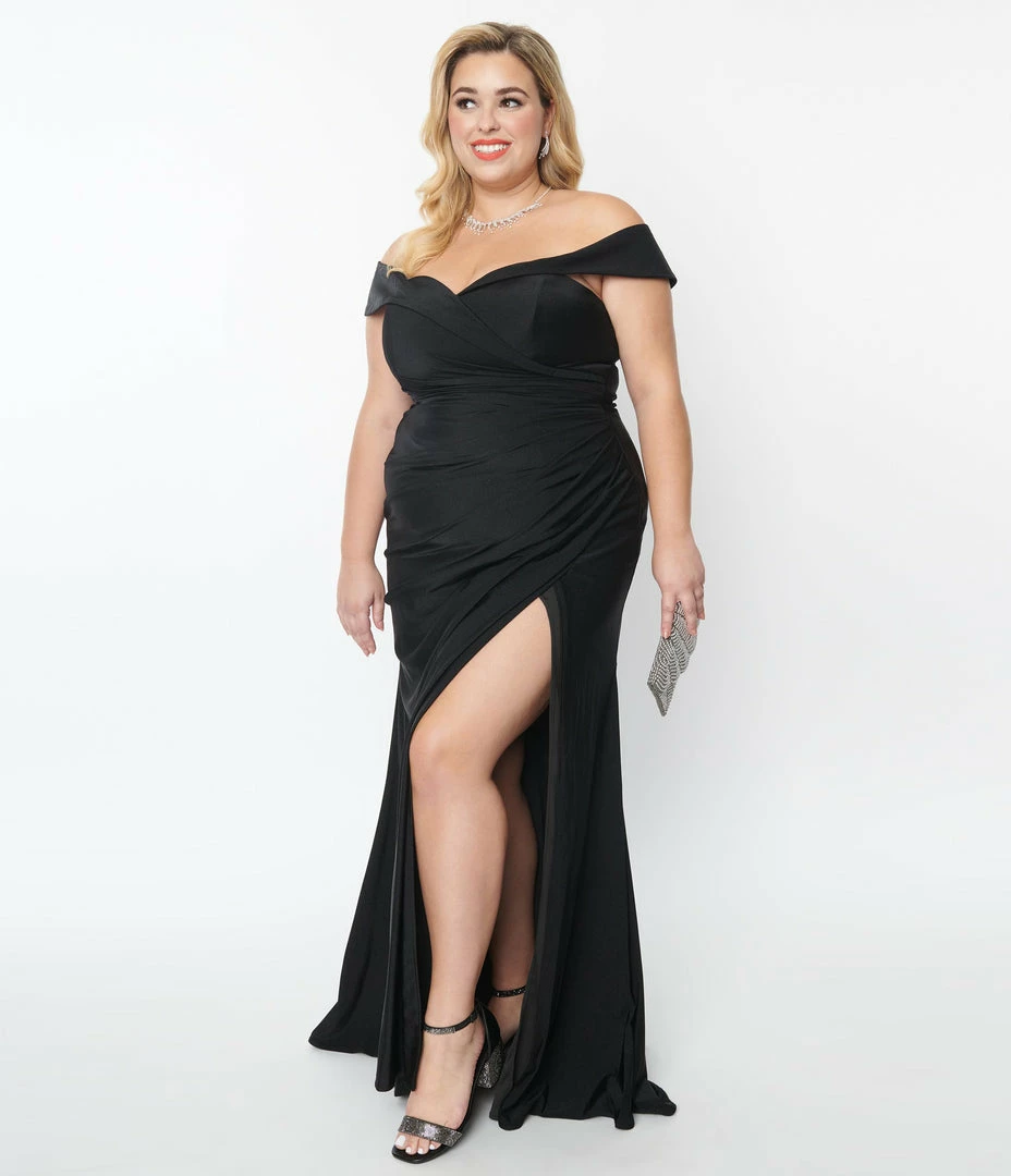 This gorgeous plus size black gown boasts a sultry off the shoulder design. The sweetheart neckline tops the princess seamed and padded bodice while the sweeping long skirt features a faux wrap design and sultry side slit. Outfitted with a back zipper!