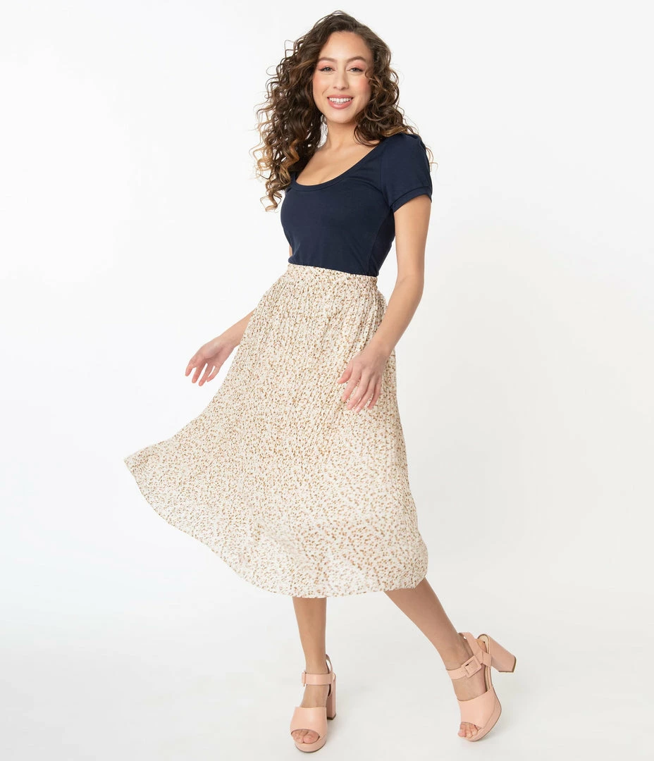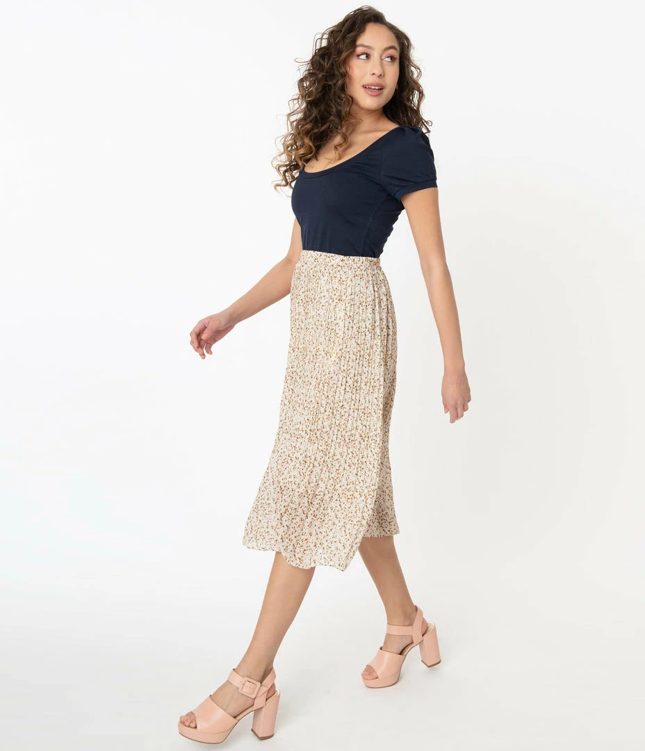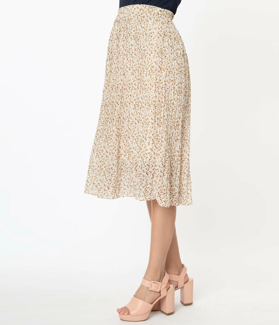 You wonโt want to sit still, dolls! A fabulous piece for your vintage ensemble, this modest midi skirt dances with a dainty pink and brown floral print throughout the cream crepe. A delightful accordion pleated design provides eye-catching accent as the elastic band waist cinches in your feminine form!
