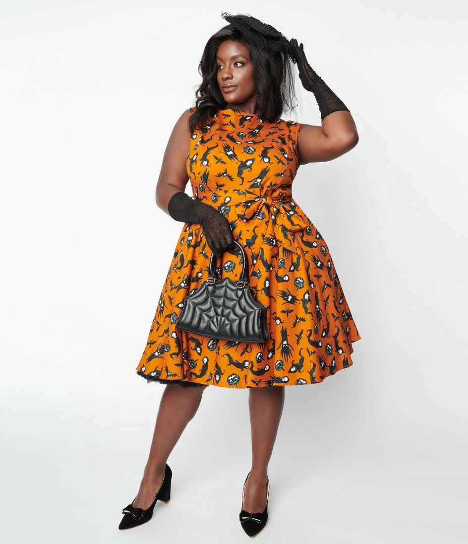 Promo ✔️ Miss Lulo, Inc. Plus Size Orange & Spooky Ghost Print Swing 👗 Dress 🤩