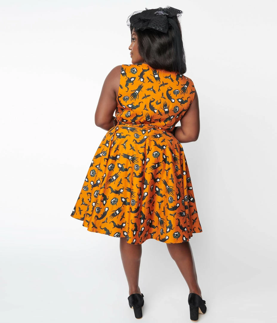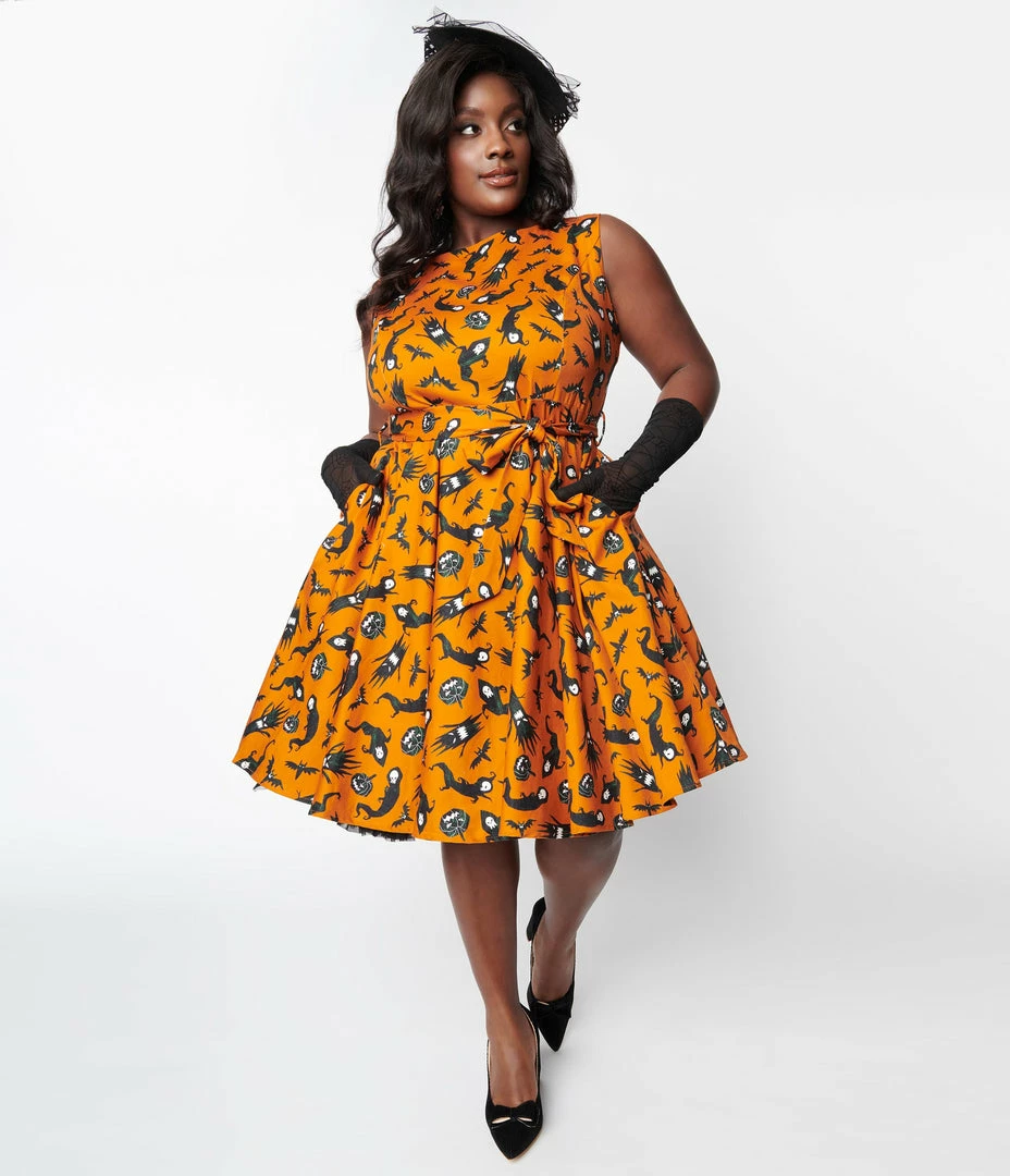 This frightening plus size swing dress is crafted in cotton and boasts a spooky print of black ghosts, trees, and jack-o-lanterns throughout the orange backdrop. The sleeveless silhouette is nipped in by the back zipper, while the swing skirt boasts side pockets!