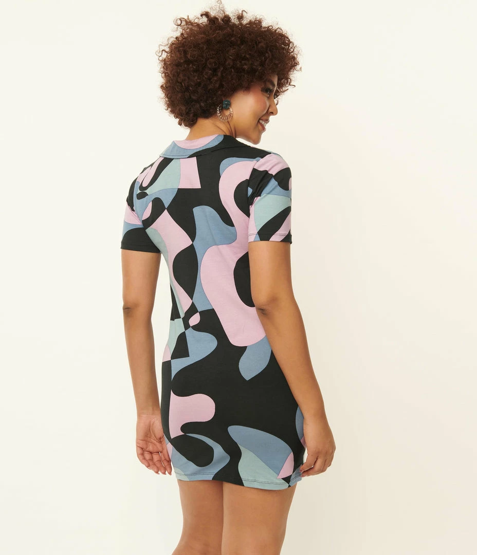 Crafted in a lightweight stretch cotton knit with a swirled print in shades or purple, blue, and black. Complete with a collared V-neck, short sleeves, and mini length skirt.