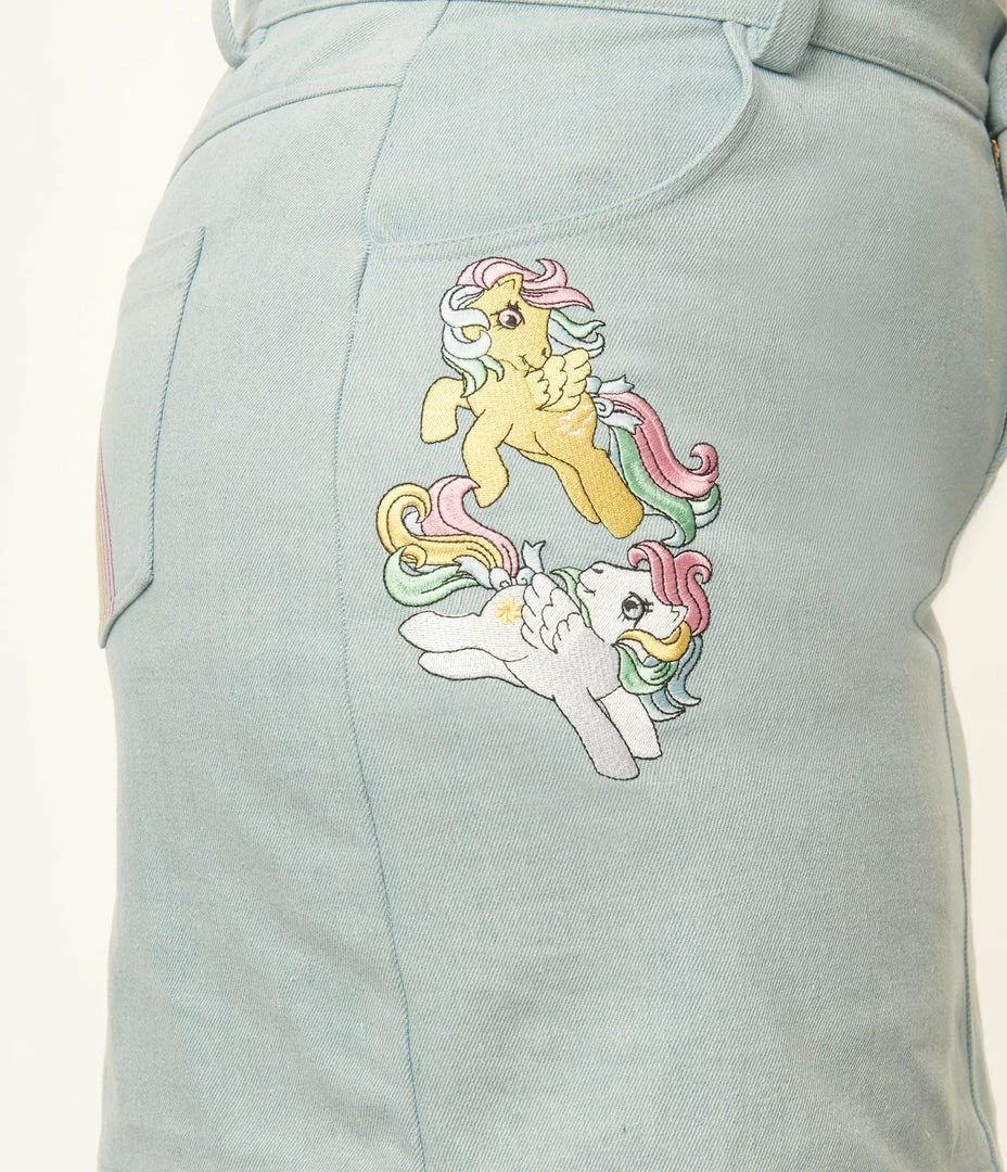 This sweet plus size mini skirt, in magical collaboration with My Little Pony, is crafted in a light blue denim blue fabric and features a cute embroidered patch of two Ponies on the hip. Outfitted with side pockets and a front fly.