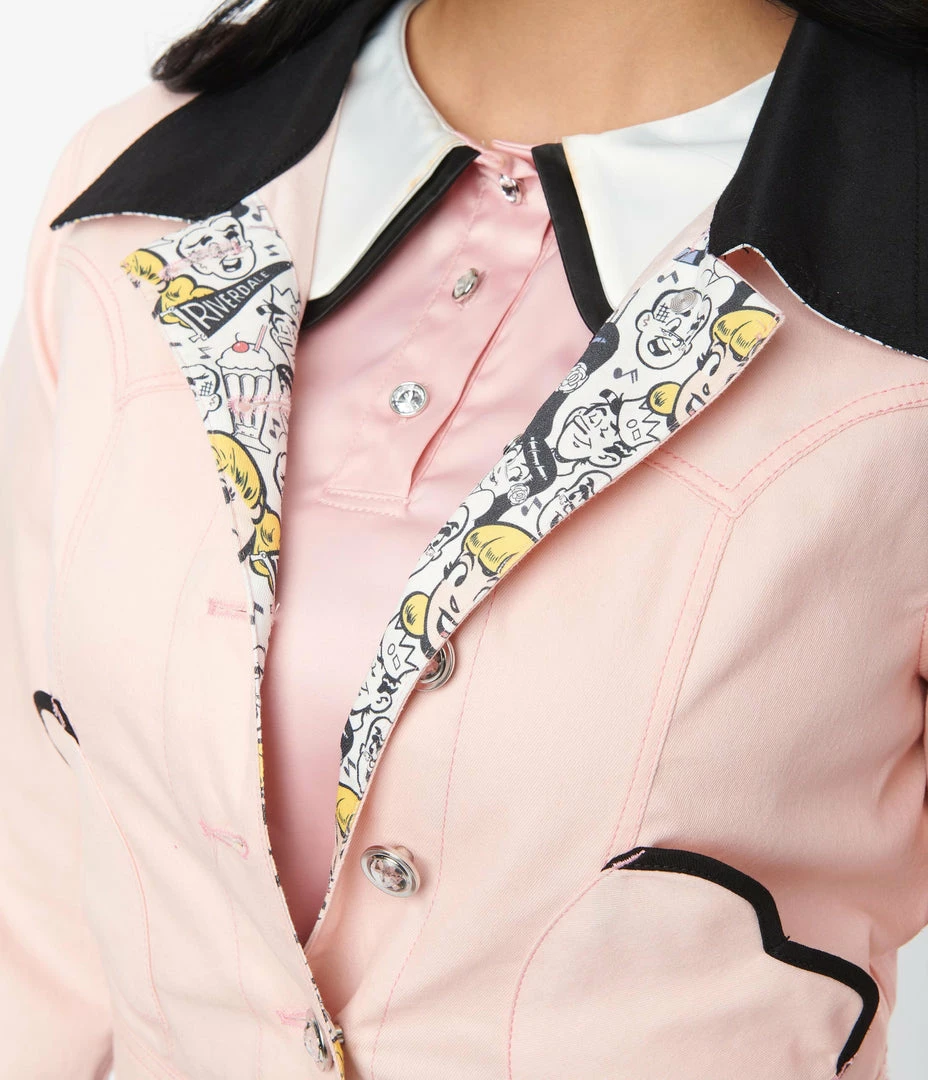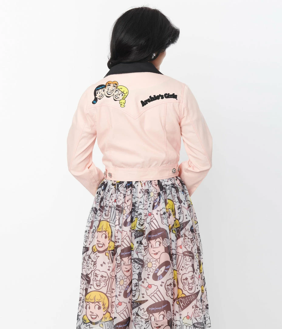 This charming pink denim jacket is set in a boxy crop silhouette and features a rhinestone button up front and embroidered patches on the back of Archie, Betty, and Veronica. Complete with long button sleeves and heart shaped pockets.