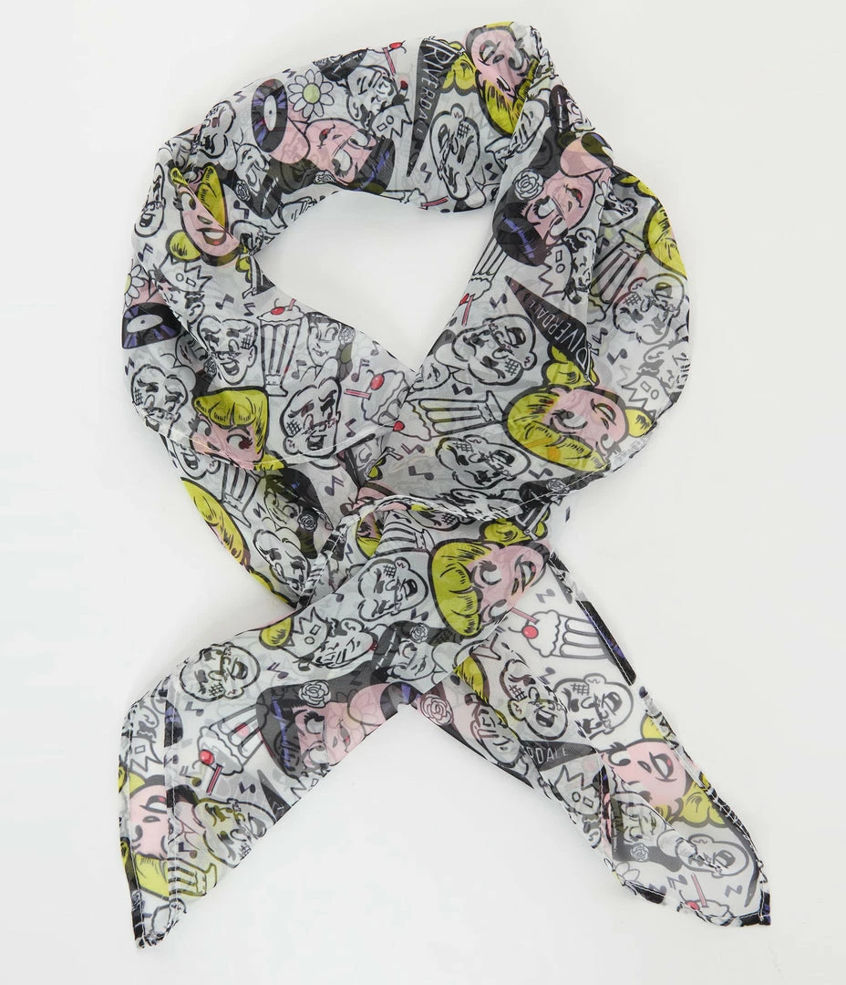 This adorable hair scarf, in collaboration with Betty and Veronica, is crafted in a sheer chiffon-style fabric that dances with an all over print of Betty, Veronica, Archie, Jughead, milkshakes, records, and Riverdale banners throughout the sheer mesh.