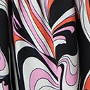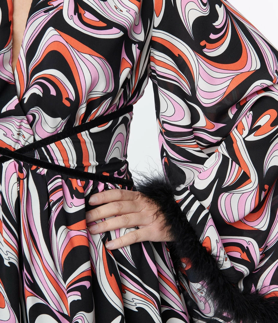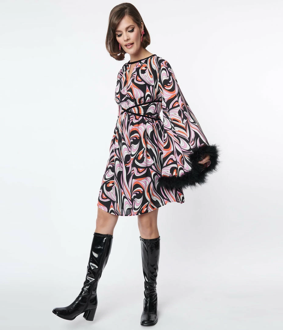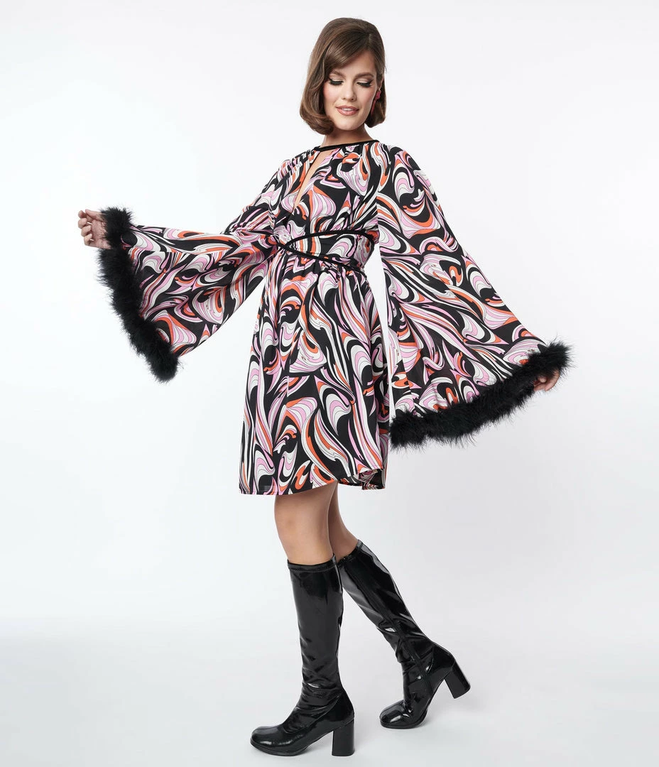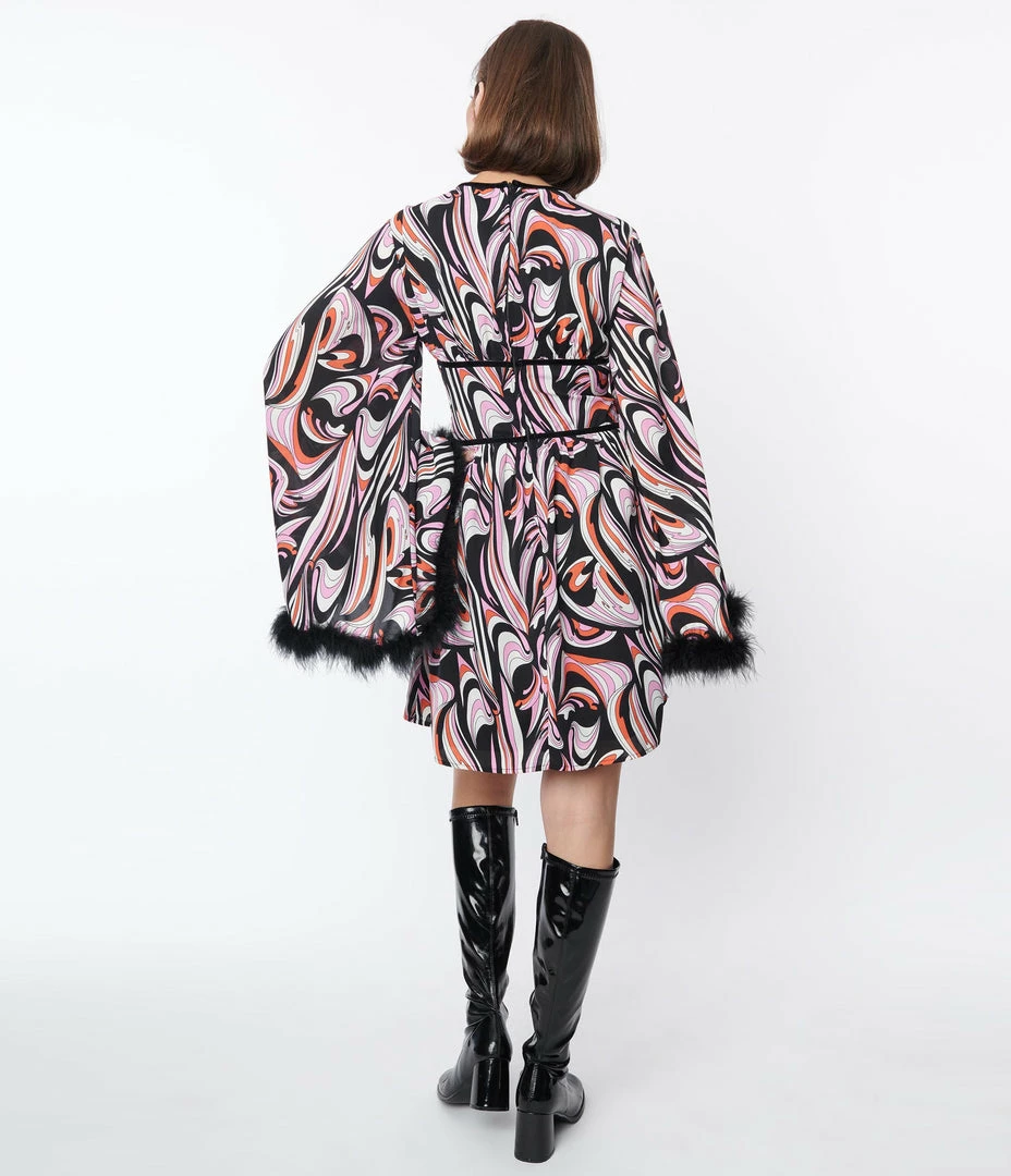 This dazzling dress is a retro treat, cast in chiffon that dances with a psychedelic print in shades of black, pink, and white. The surplice bodice is trimmed at the collar in black velvet creating a sultry keyhole that is framed by dramatic bell sleeves with black feather cuffs. Complete with back zipper.
