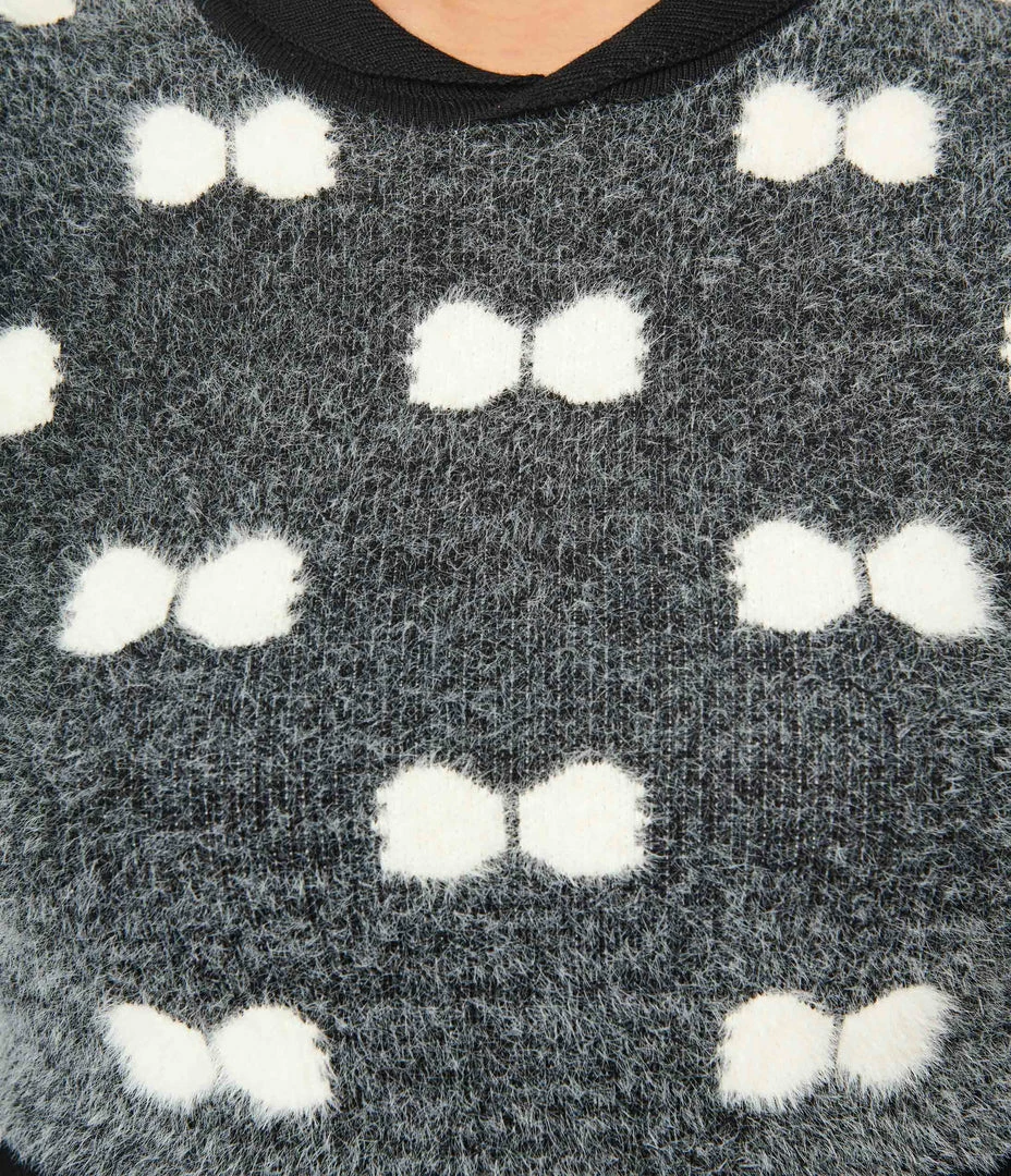 Crafted in a soft fuzzy knit fabric featuring ivory bows throughout the black backdrop. Featuring a long sleeve silhouette with ribbed knit cuffs.