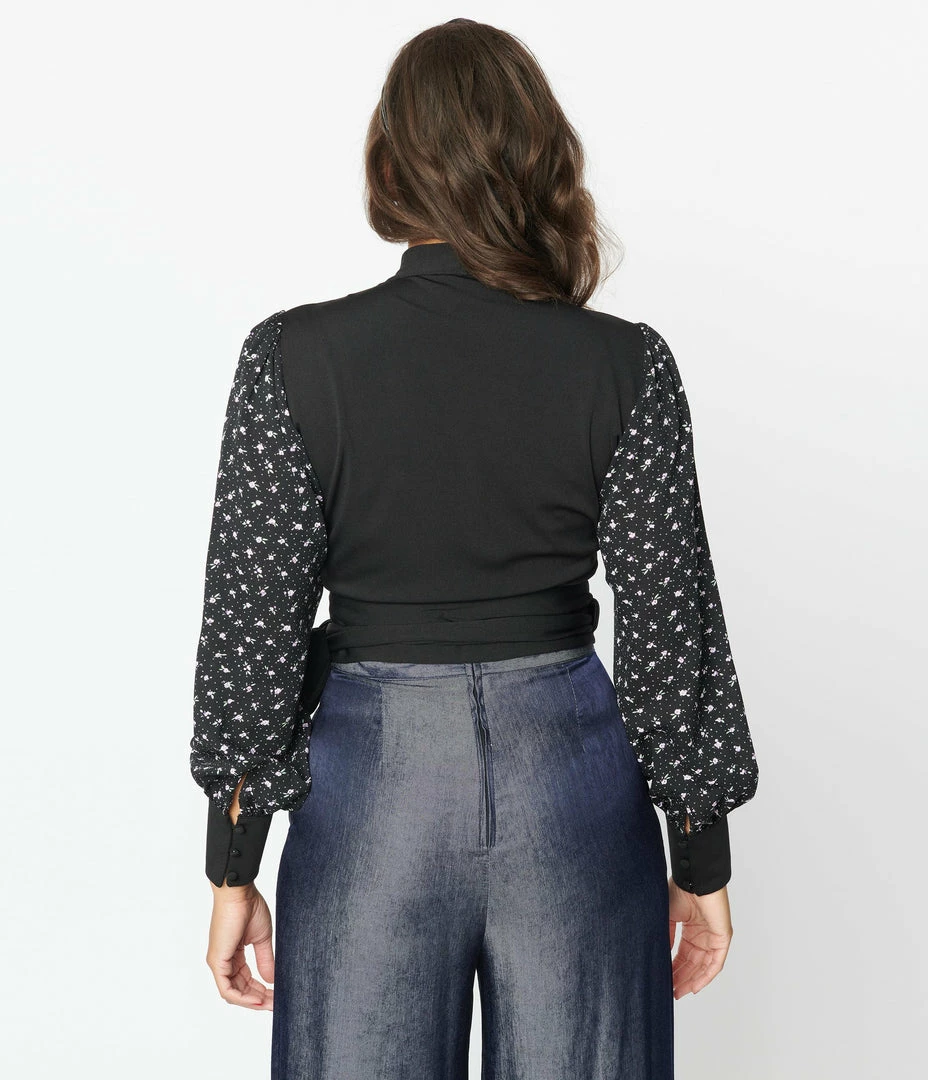 The Giselle Top is cast in a gorgeous black knit that features attached waist ties for a flattering full wrap cinch. The chiffon long sleeves dance with dainty purple florals while the button cuffs lend vintage grace to your silhouette!