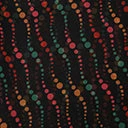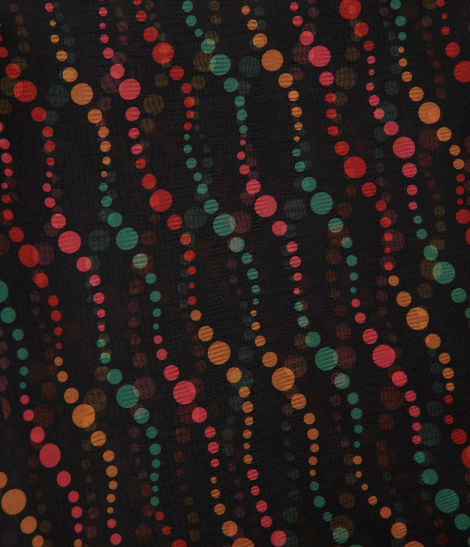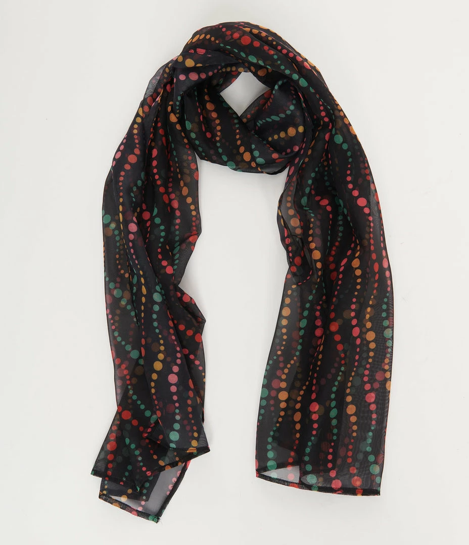 This long hair scarf is crafted in a silky chiffon style fabric that features rainbow polka dots set in wiggly stripes throughout a black backdrop.
