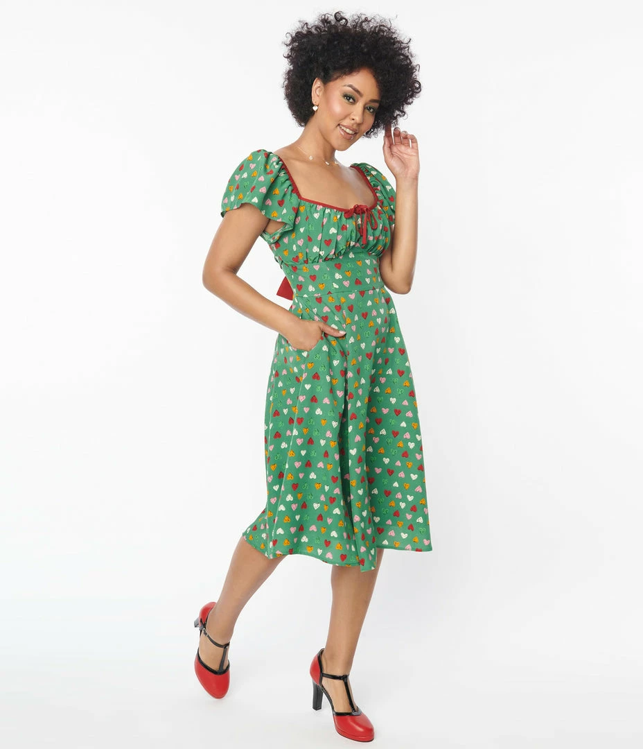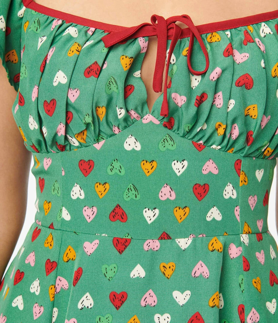 Outlet ๐ New Arrivals! Unique Vintage Green & Multi Heart Print Swing ๐ Dress ๐