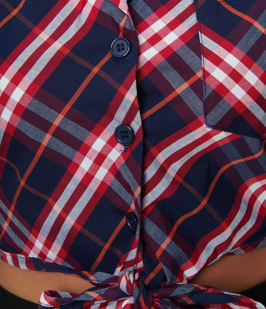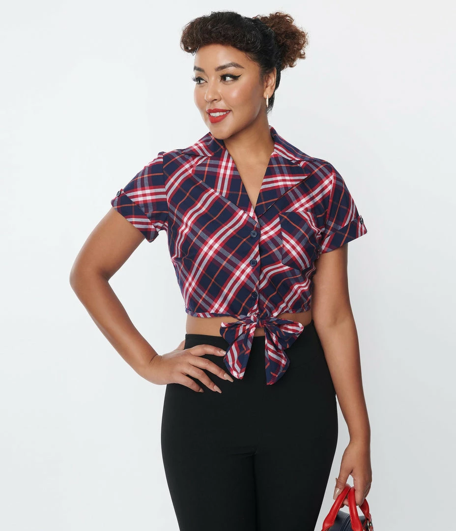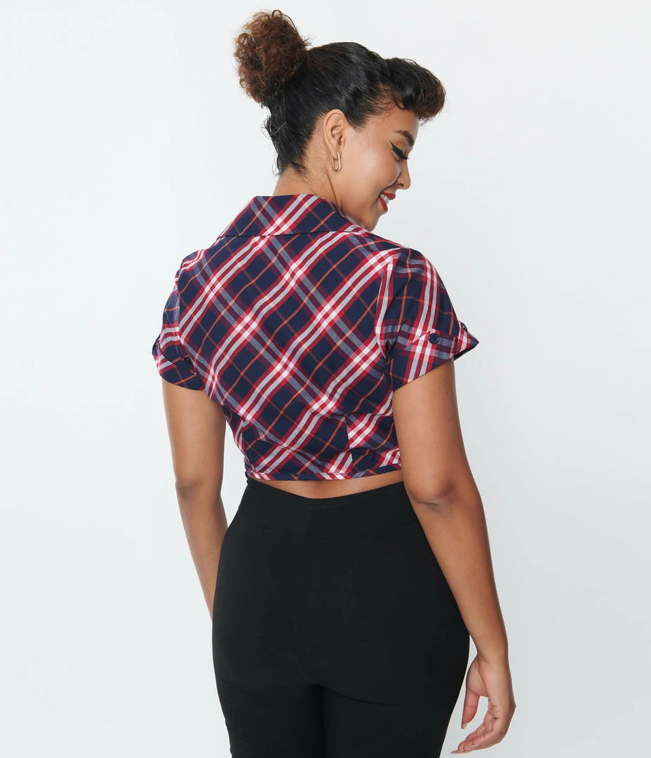 Buy 🛒 New Arrivals! Unique Vintage Navy & Red Plaid Print Shirley Crop Top 🔥