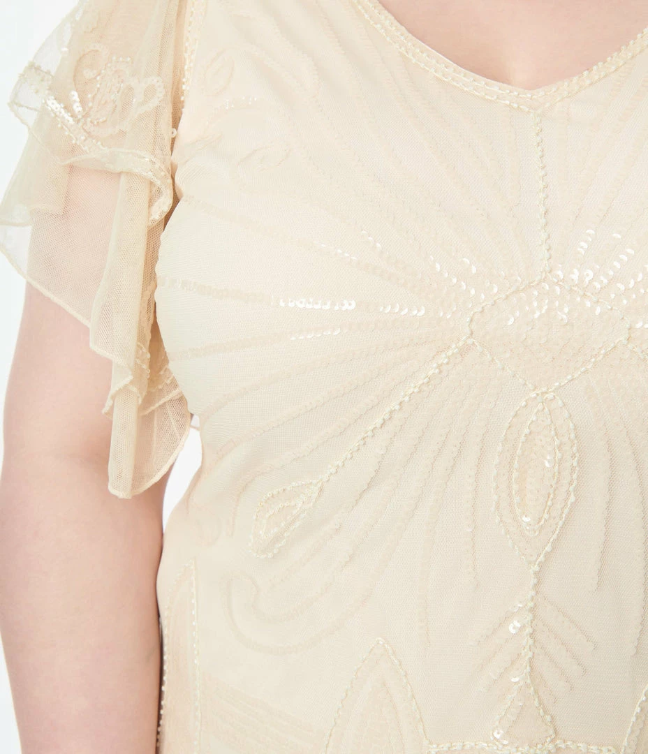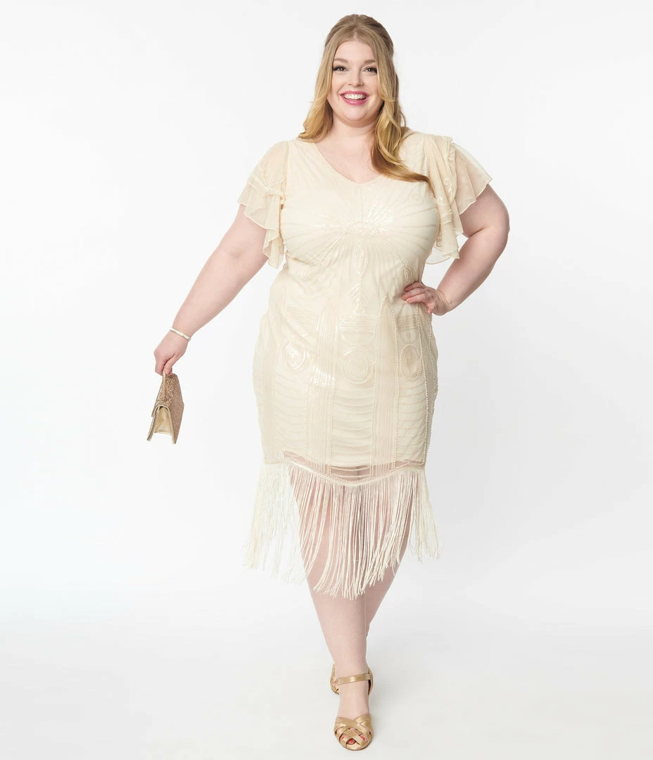 This sultry plus size flapper dress is crafted in cream mesh that sparkles with iridescent sequins and cream beading throughout. Complete with a V-neckline, short flutter sleeves, long fringe, and a back zipper.