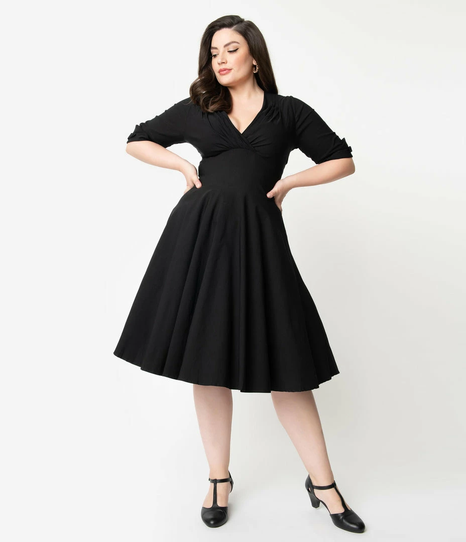 Let Delores get domestic with you, darling. A bewitching black frock rich in plus size 1950s vintage dress appeal fresh from Unique Vintage, Delores is unparalleled! Boasting a gathered surplice v-neckline, trim and tailored half sleeves with darling button detail and a thick banded natural waistline that creates a minimized silhouette. An ample A-line swing skirt billows to knee length in soft pleats, zipping slyly up the back. Crafted in a supremely soft stretch blend in stunning retro structure, forming an understated yet flattering design. Fabulously floored!
