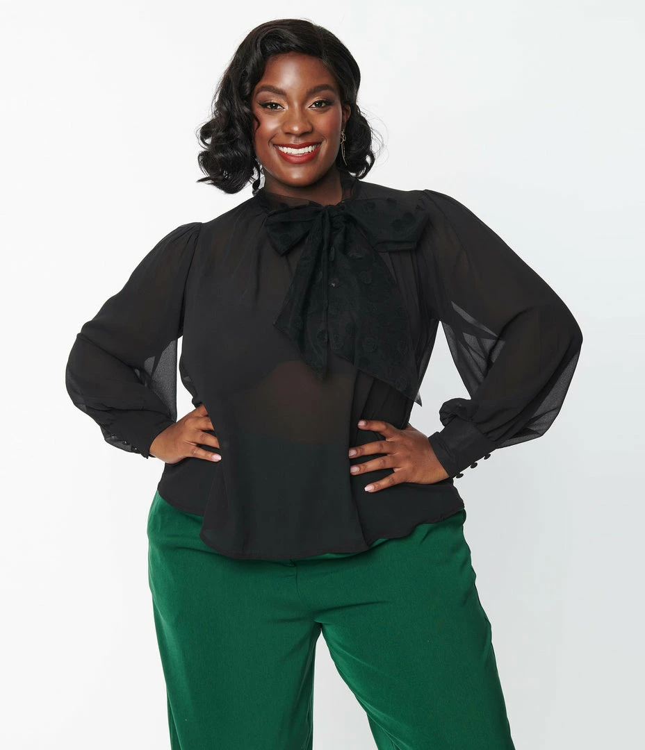 This elegant plus size blouse is crafted in a lightweight chiffon and set in solid black that features clip dots throughout. Outfitted with a self tie neck bow with flocked polka dots, long sleeves, and button cuffs.