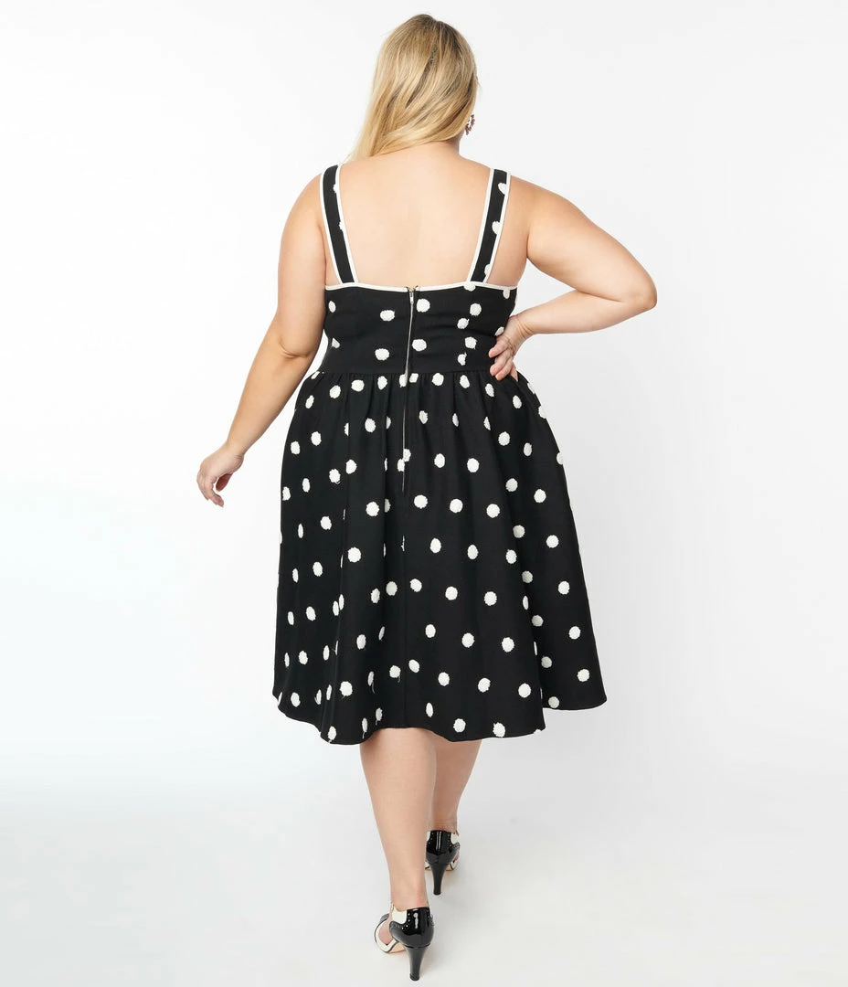 Flash Sale 🎁 New Arrivals! Unique Vintage Plus Size Black & Ivory Flocked Polka Dot Pinafore Swing 👗 Dress ⌛