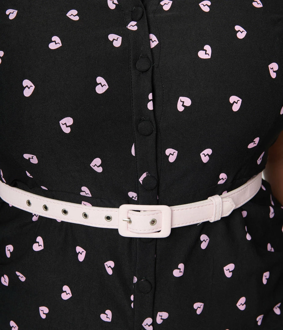 This adorable and playful plus size romper is crafted in a black bengaline that dances with pink broken hearts and outfitted with a button up front and matching belt. Complete with side and back pockets.