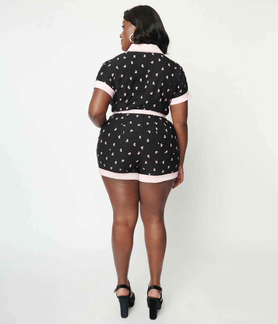 Buy ๐ New Arrivals! Unique Vintage Plus Size Black & Pink Broken Hearts Patsy Romper ๐งจ