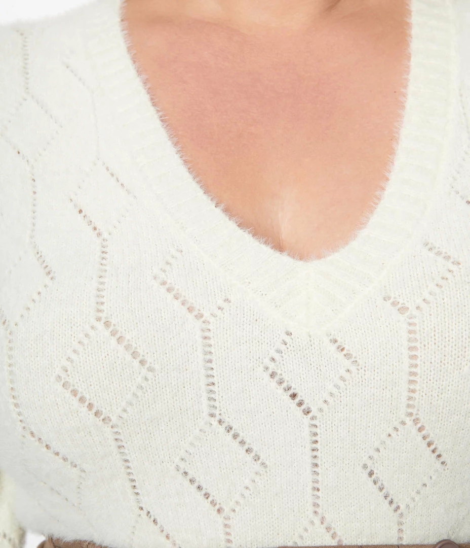 This sweet plus size sweater is crafted in an ivory fuzzy knit and boasts perforated detailing throughout. The V-neckline is framed by slender long sleeves, while the wide rib hem line pairs perfectly with your favorite bottoms!