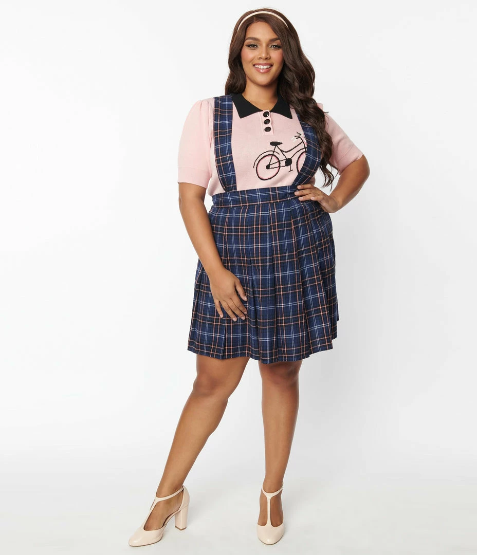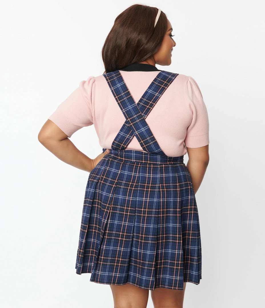 Deals ๐ New Arrivals! Unique Vintage Plus Size Navy Plaid Pleated Suspender Mini ๐ Skirt ๐งจ