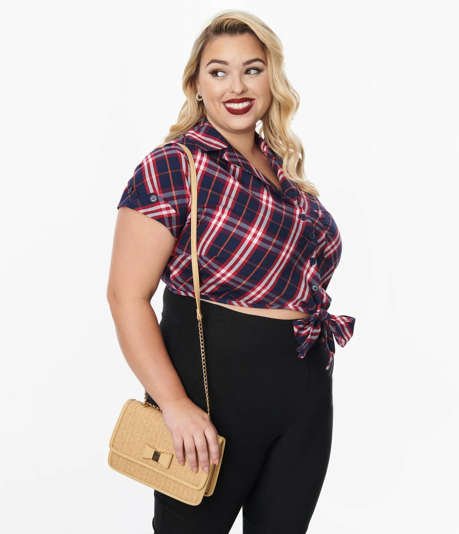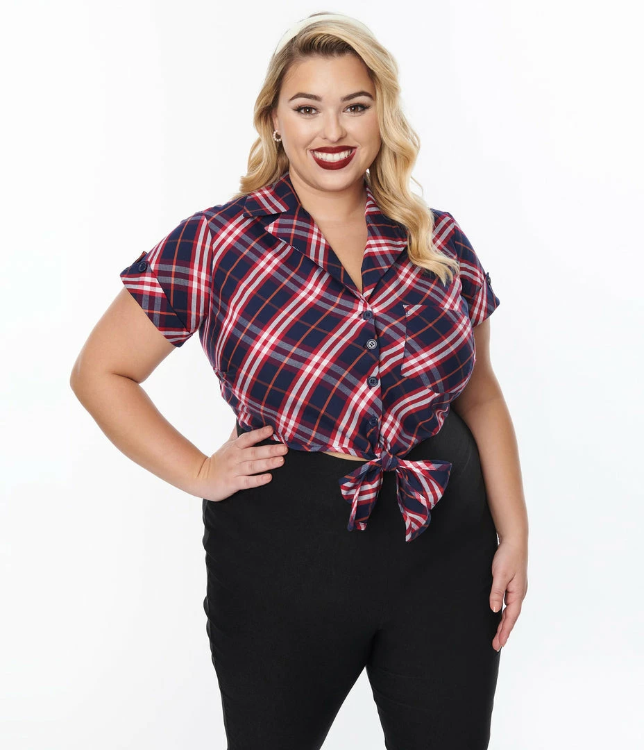 Discount ⭐ New Arrivals! Unique Vintage Plus Size Navy & Red Plaid Print Shirley Crop Top ❤️
