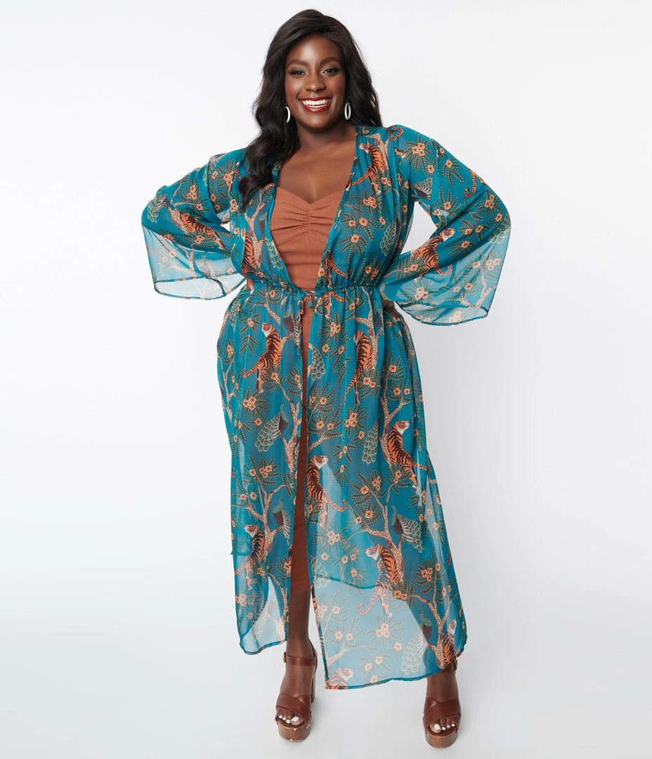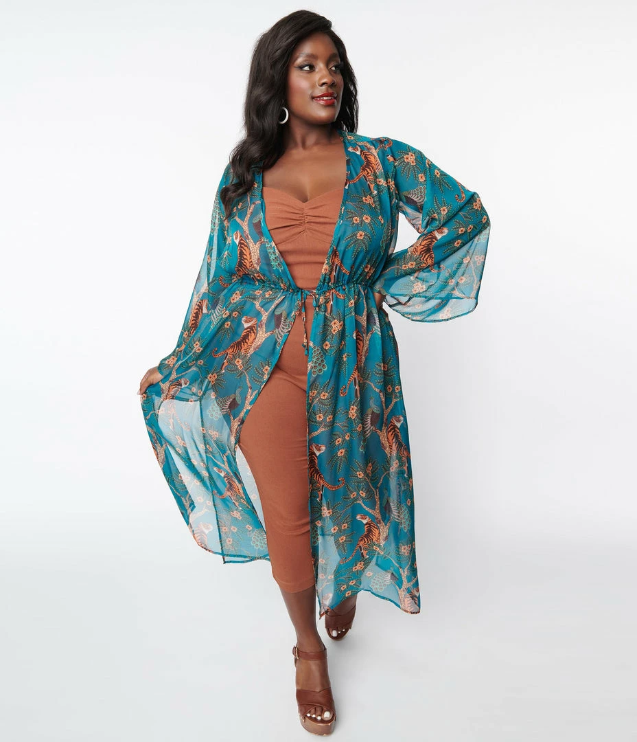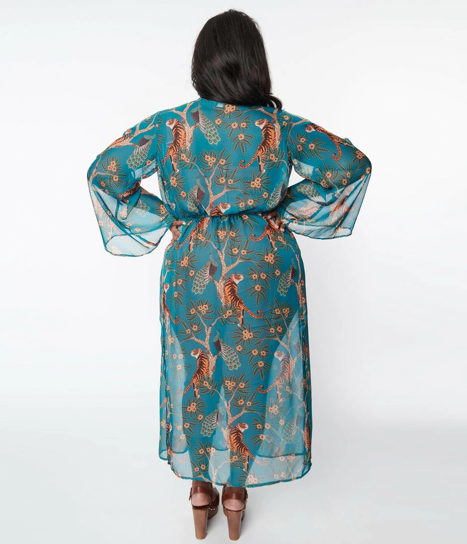 This divine plus size kimono is crafted in a flowy chiffon dancing with peacocks and tigers throughout the teal backdrop. The open front is framed by long bell sleeves while the pull tie center provides secure wear. Complete with dual side slits for unrestricted sauntering!