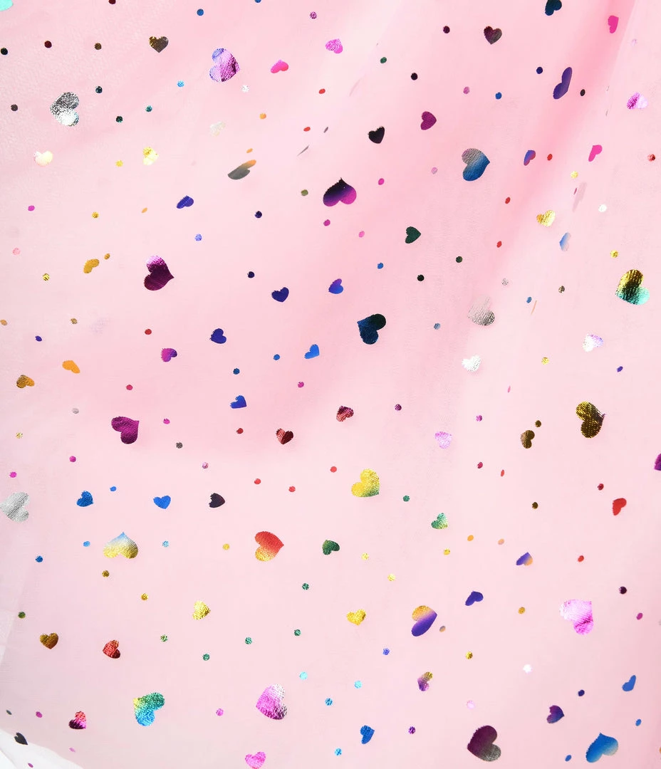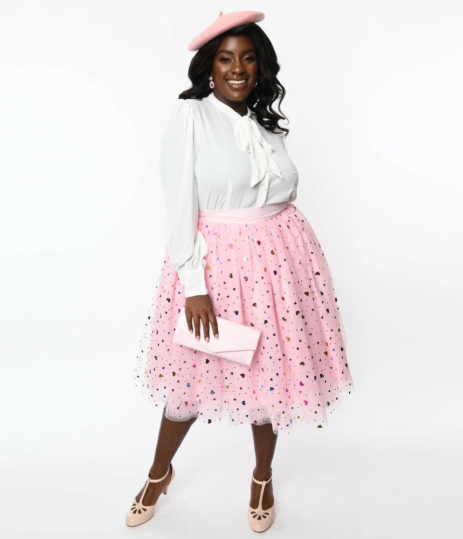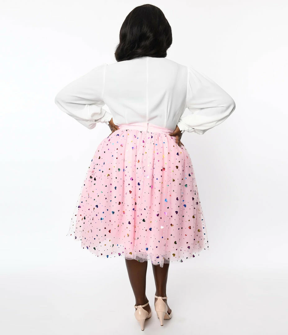 This adorable plus size separate dances with light pink mesh nota sparkles with rainbow metallic hearts throughout. The Sweetie Pie Skirt features a high banded waist, cinched with a back zipper while layers of mesh and tulle cascade over lining and drop to your knees, complete with hidden side pockets for modern function!