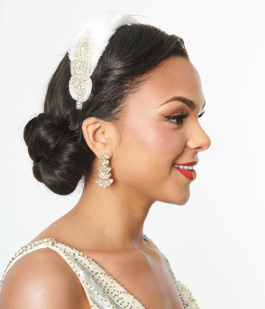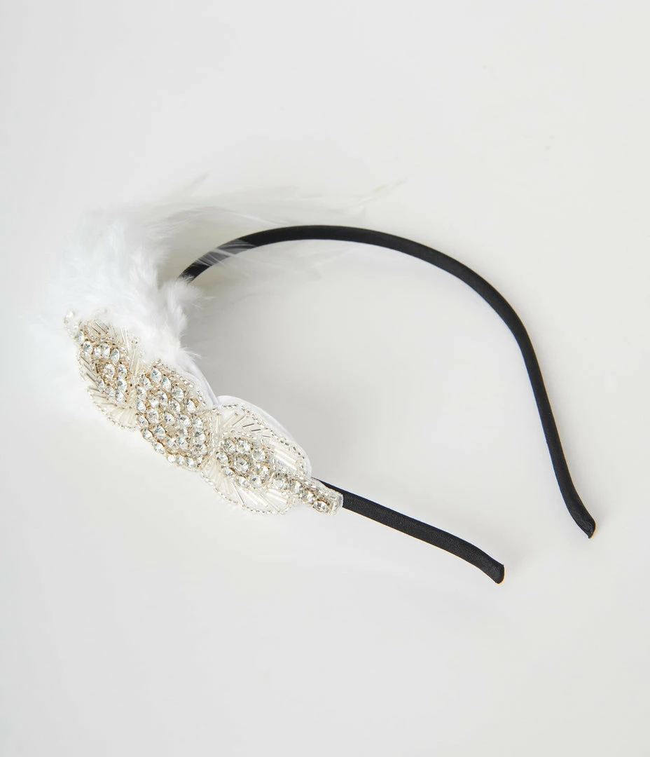 Glitzy and deco-infused, this 1920s flapper headband exudes authentic vintage glamour. Featuring graceful white coque feathers with glistening silver rhinestones and beading on a felt back atop of a wrapped wire headband.