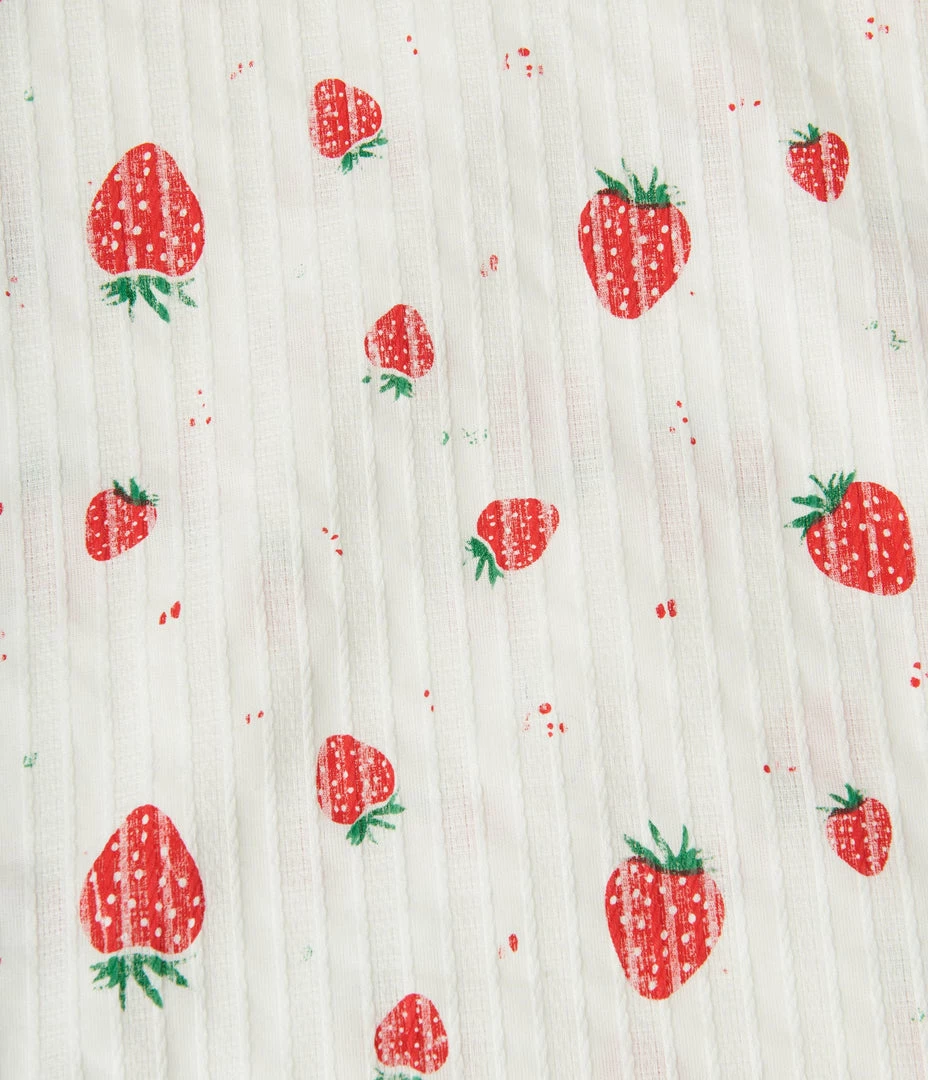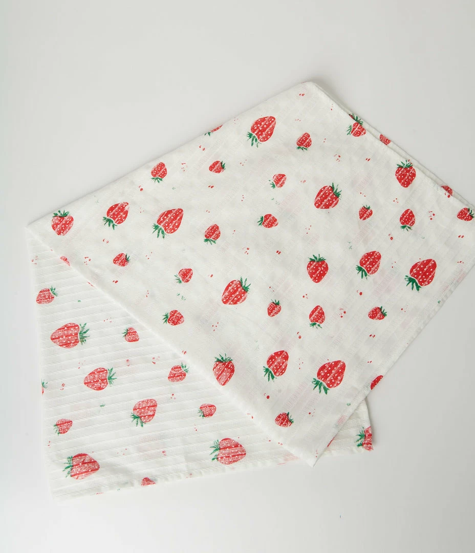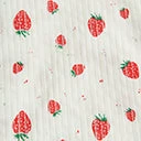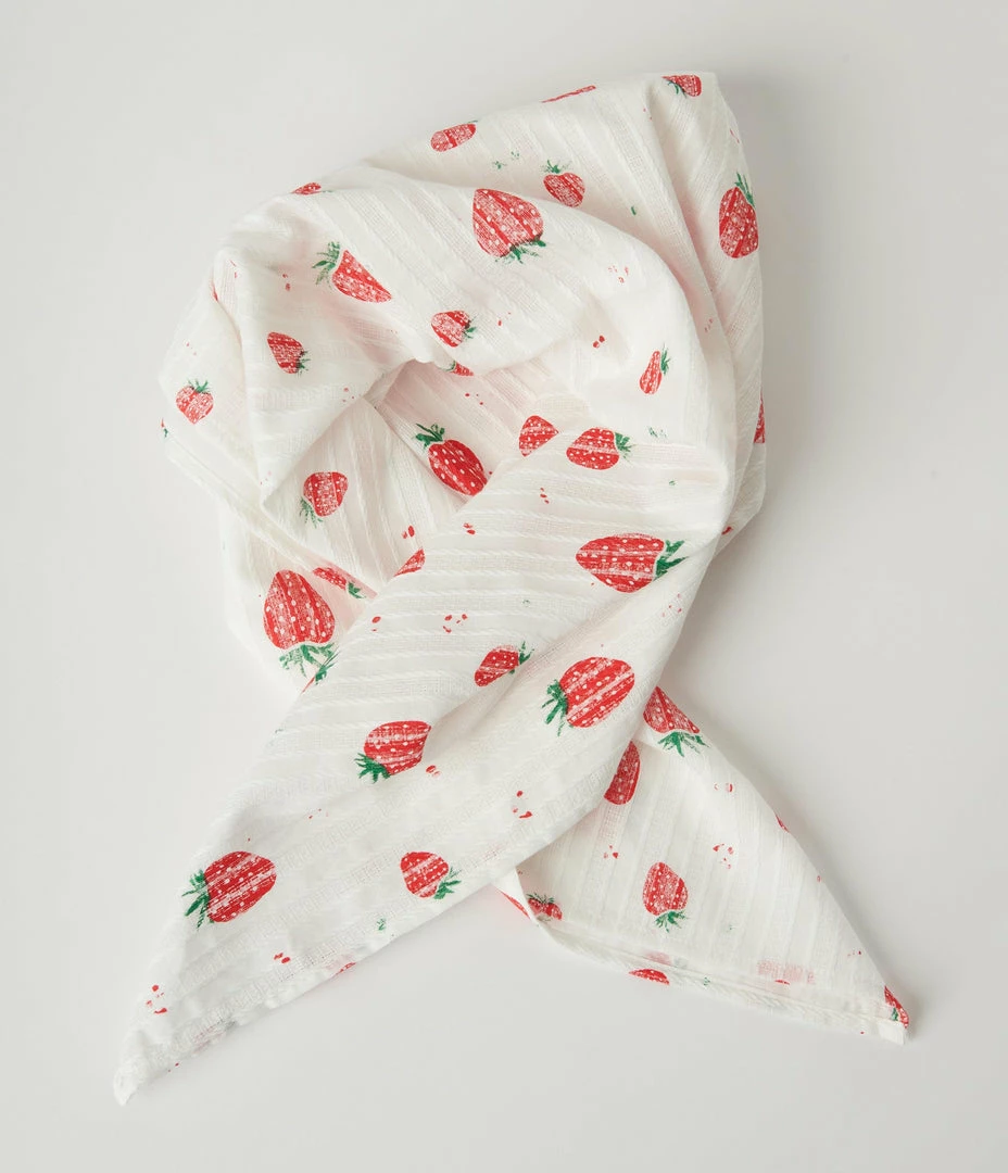 This delectable hair scarf is crafted in a woven white fabric that features a cable knit pattern and red strawberries printed throughout.