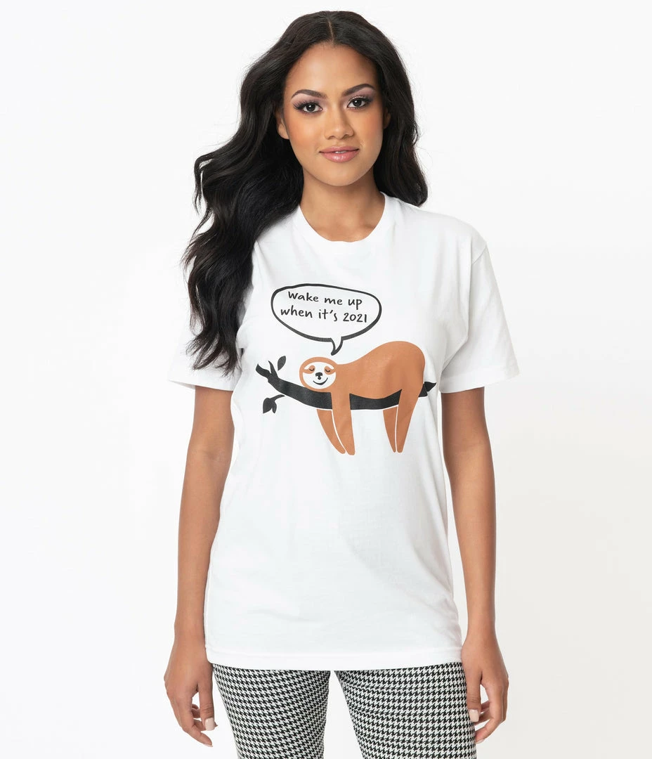 Hang in there, darlings! This casual unisex tee is crafted in marvelous white cotton and features a screen print graphic of a sloth chilling on a branch with font above it saying, ‘Wake me up when it’s 2021’. Outfitted with a crew neckline, short sleeves, and a long torso for laid-back attitudes!
