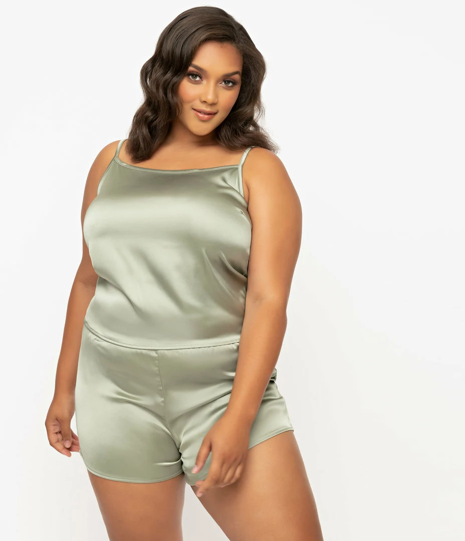 Sweet dreams, dolls! An adorable set of plus size pajama shorts, these soft separates are cast in a lightweight sage green satin fabric. Complete with elastic waistband!