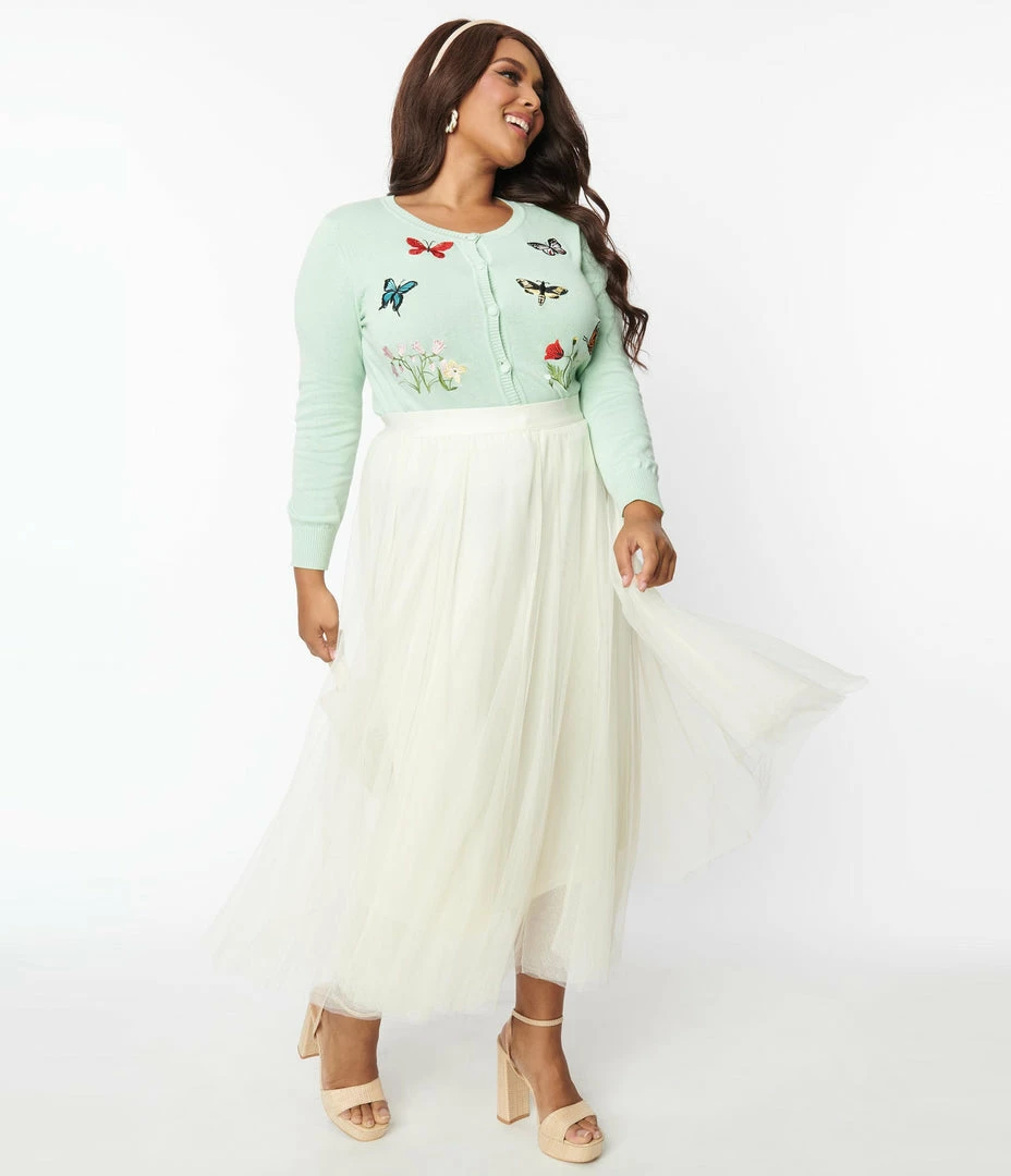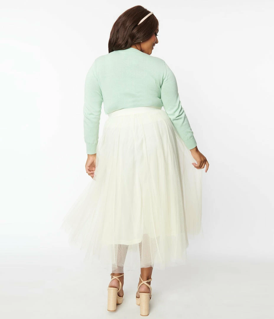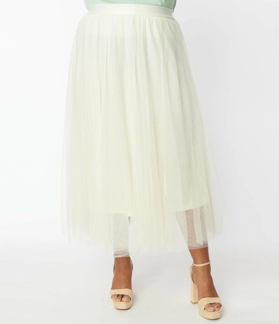 This darling plus size midi skirt is crafted in layers of cream tulle over a matching lining, complete with elastic waistband!