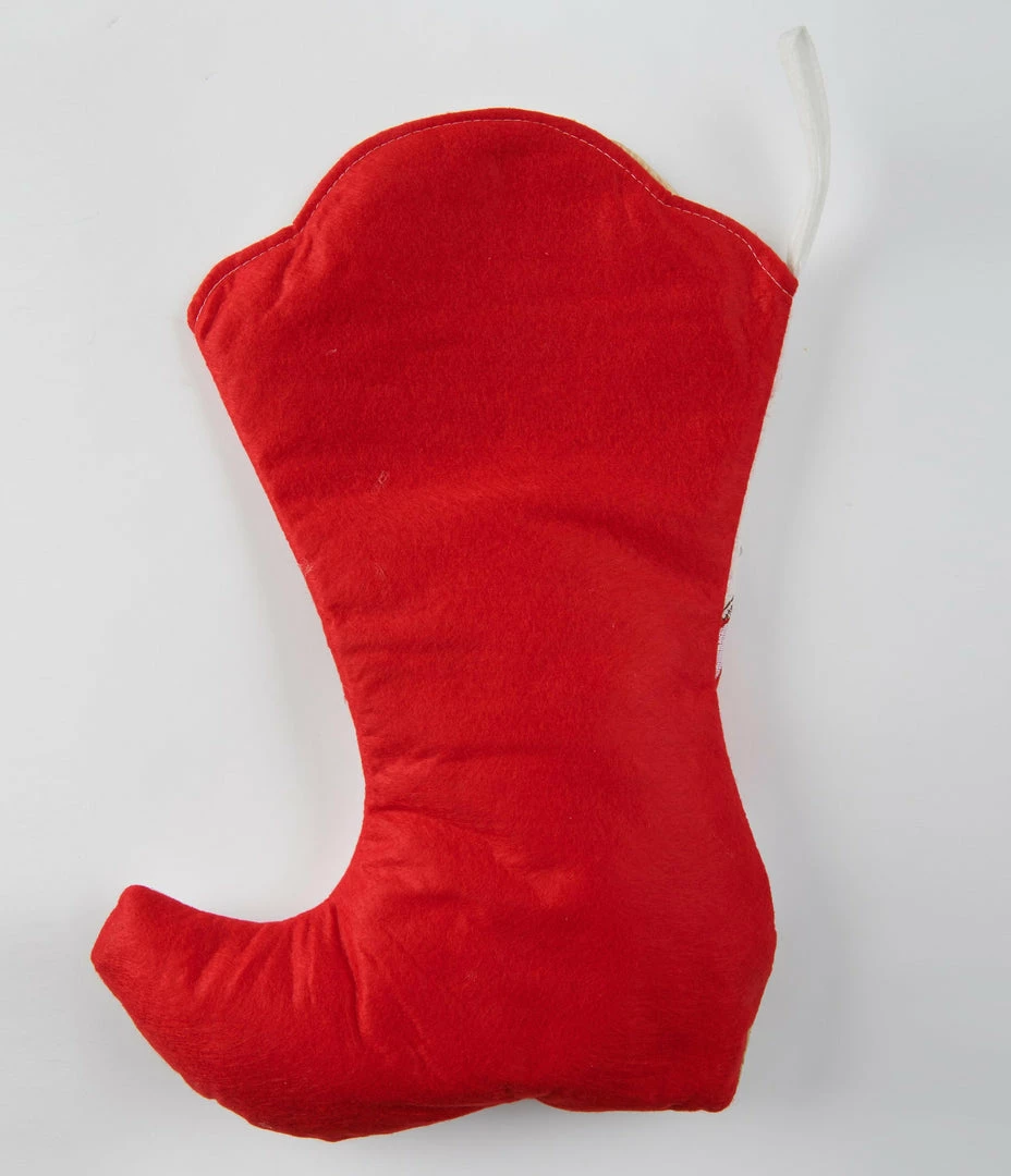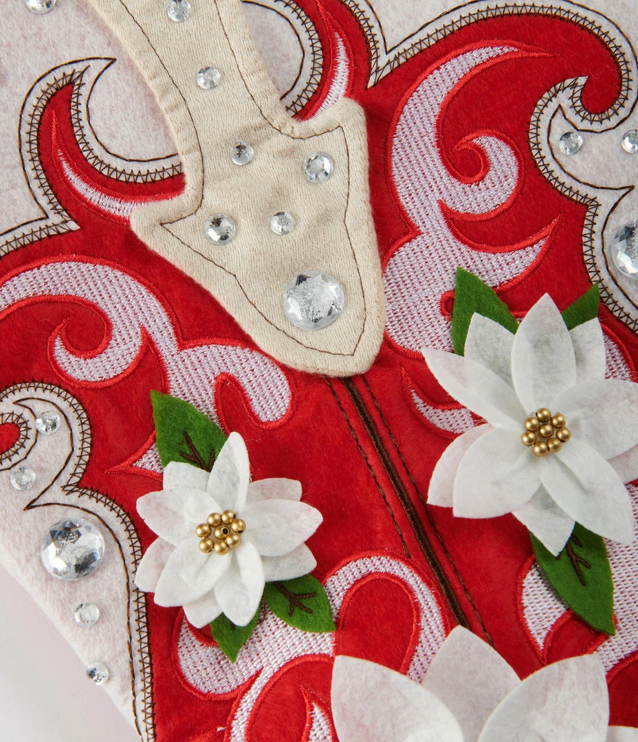 Put on your cowboy hat and rope in the holidays with this rustic cowgirl boot stocking. Inner lined with a polyester satin, the outside is crafted with a red and white felt, decorated with beautiful white flowers and silver rhinestones.