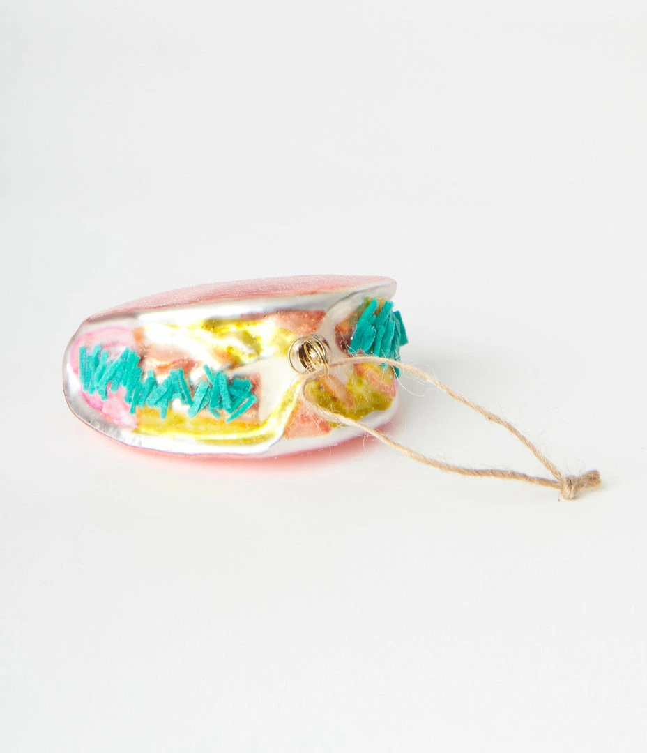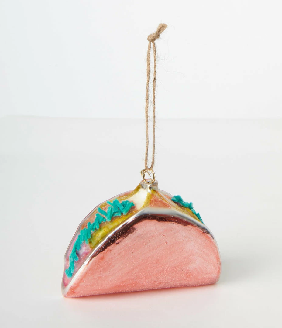 Taco Tuesday meets the holidays with this adorable taco shaped glass-blown ornament. Hand painted with metallic rose gold and decorated with a colorful green confetti filling.