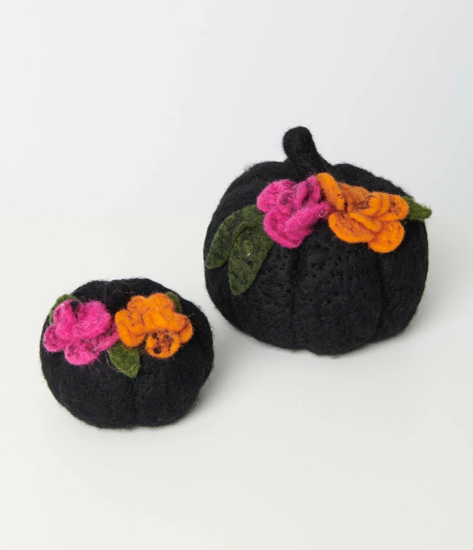 These adorable pumpkins are crafted in black felt accented with orange and pink florals.
