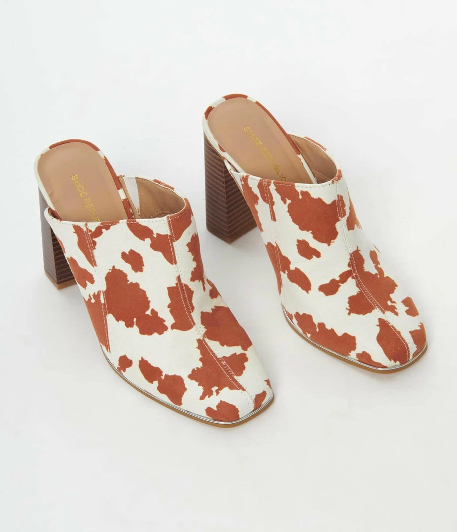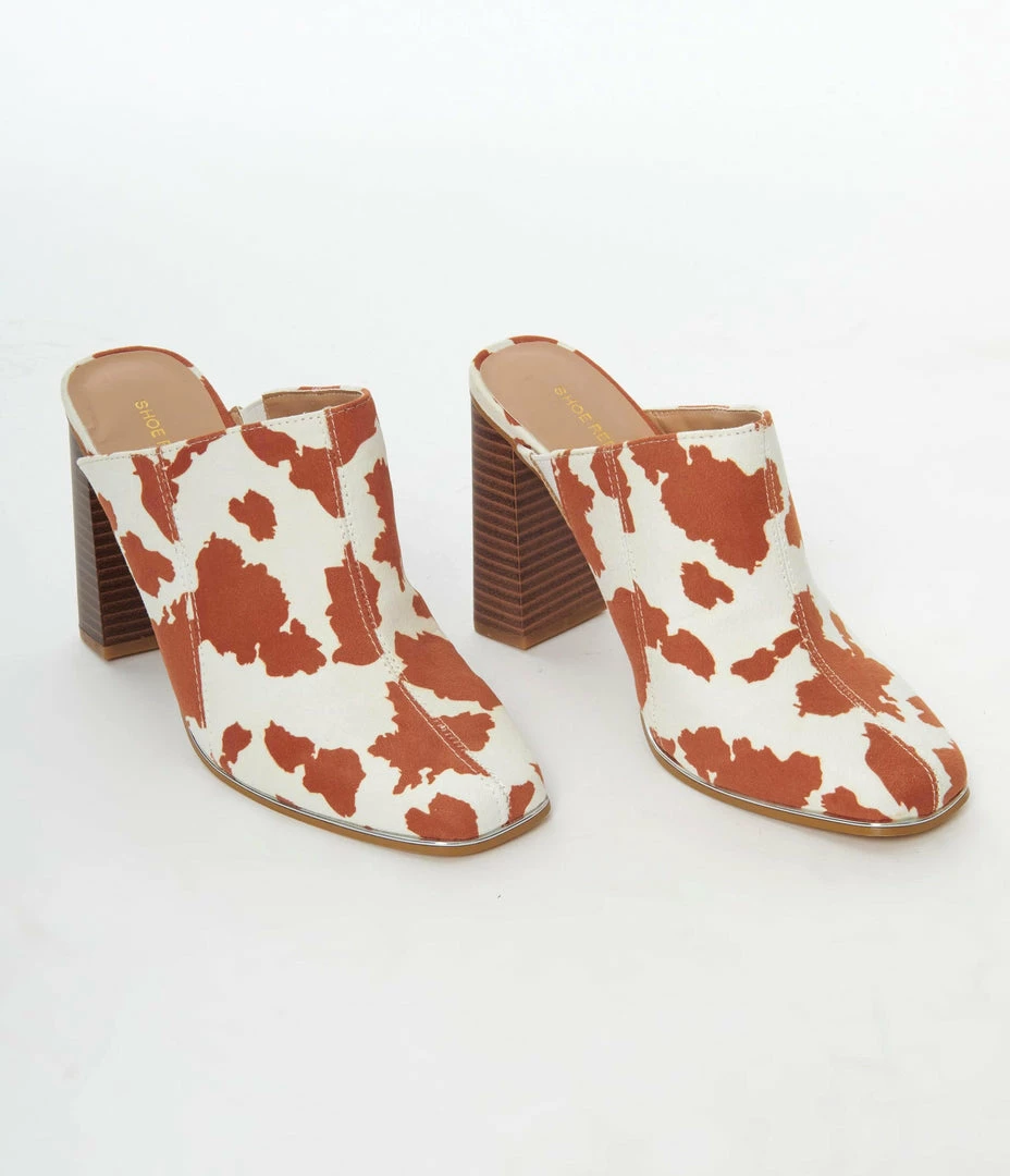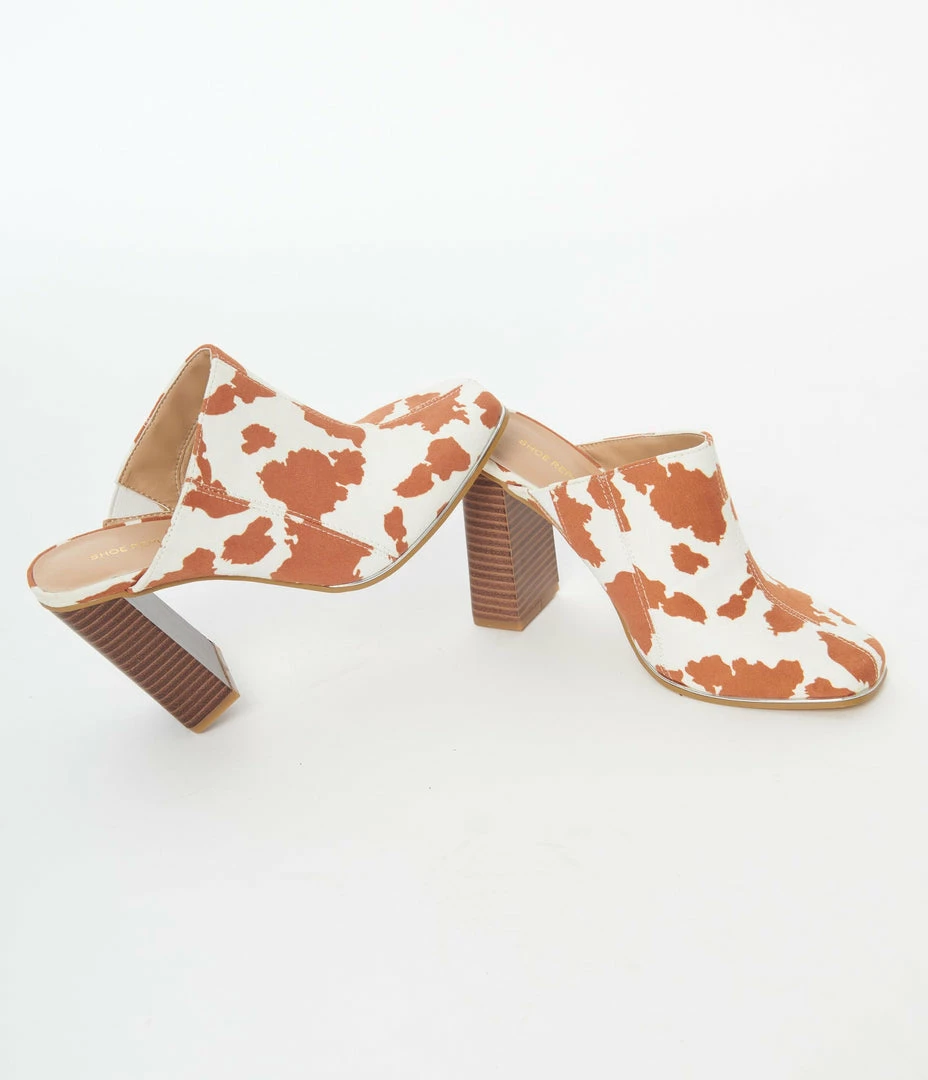 Wholesale โญ OUR LOVE LETTER INC ๐ Heels & Wedges White & Brown Cow Print Suede Mule ๐ Heels ๐ฅ