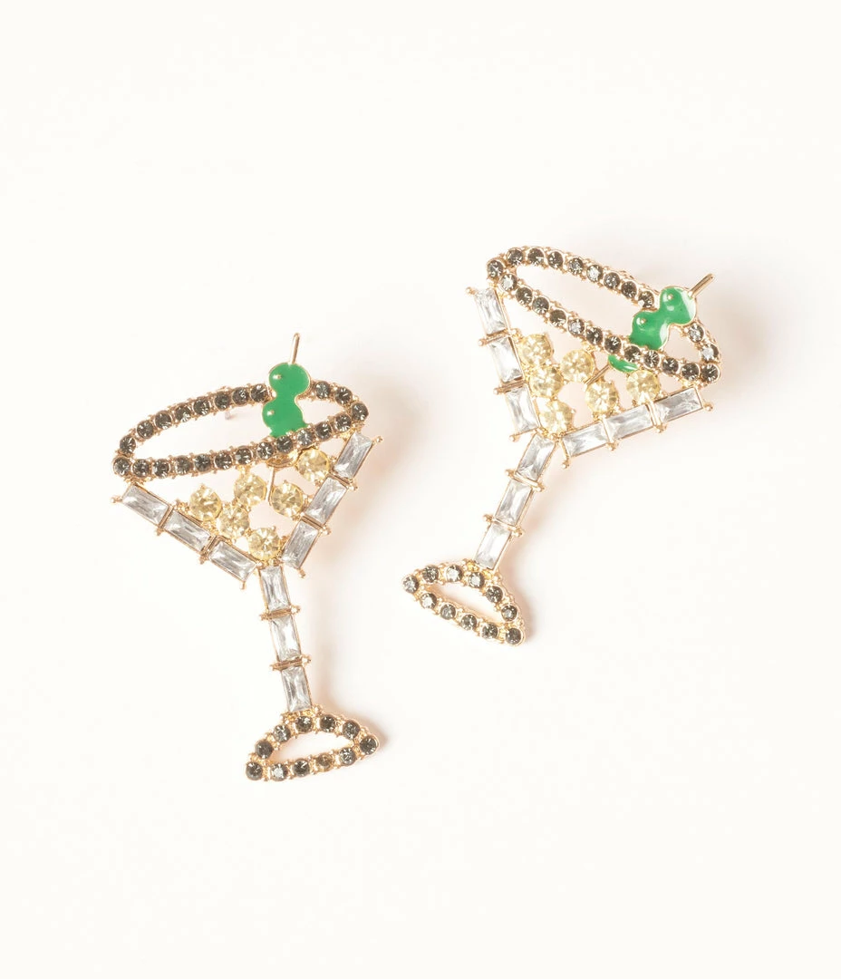 This sparkling set of earrings feature golden hardware in the shape of martini glasses, dancing with rhinestones and green enamel olives. Secured with post backs.