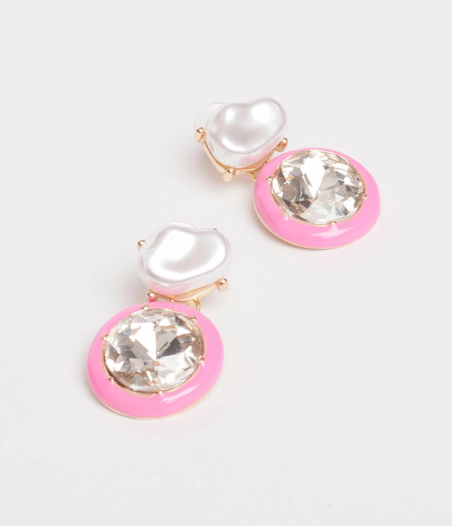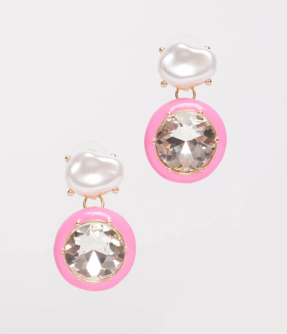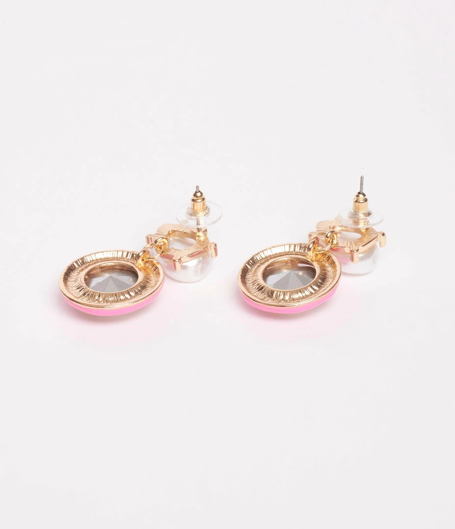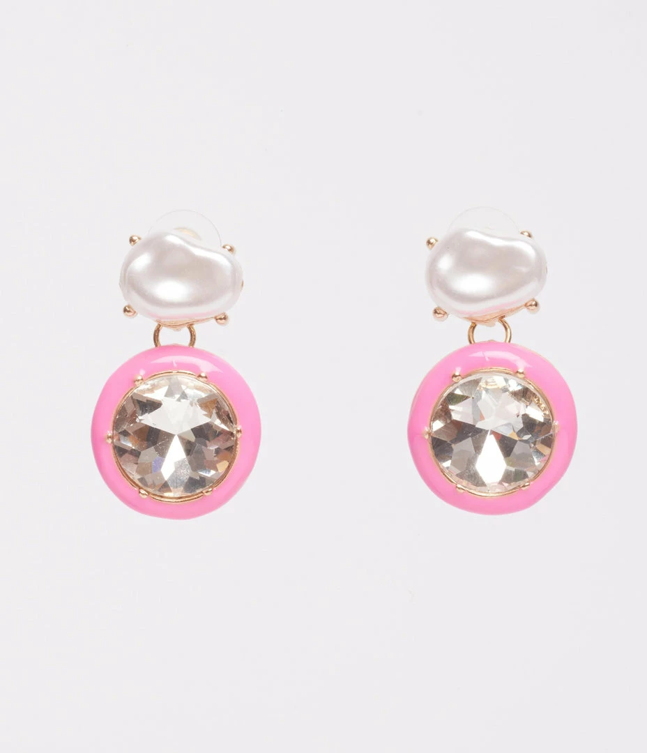 Chic and sweet, these drop earrings feature a silver rhinestone, accented with pink enamel and topped by a faux pearl stud. Secured with post backs.