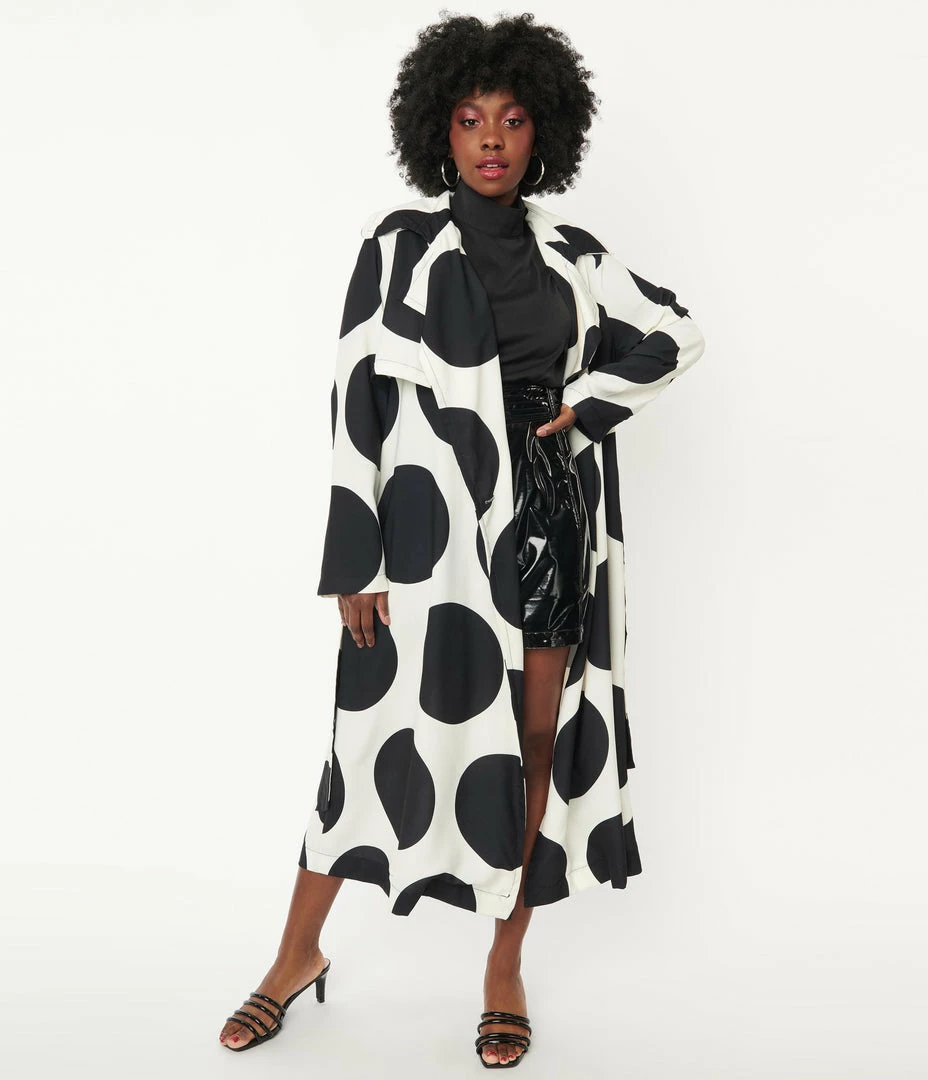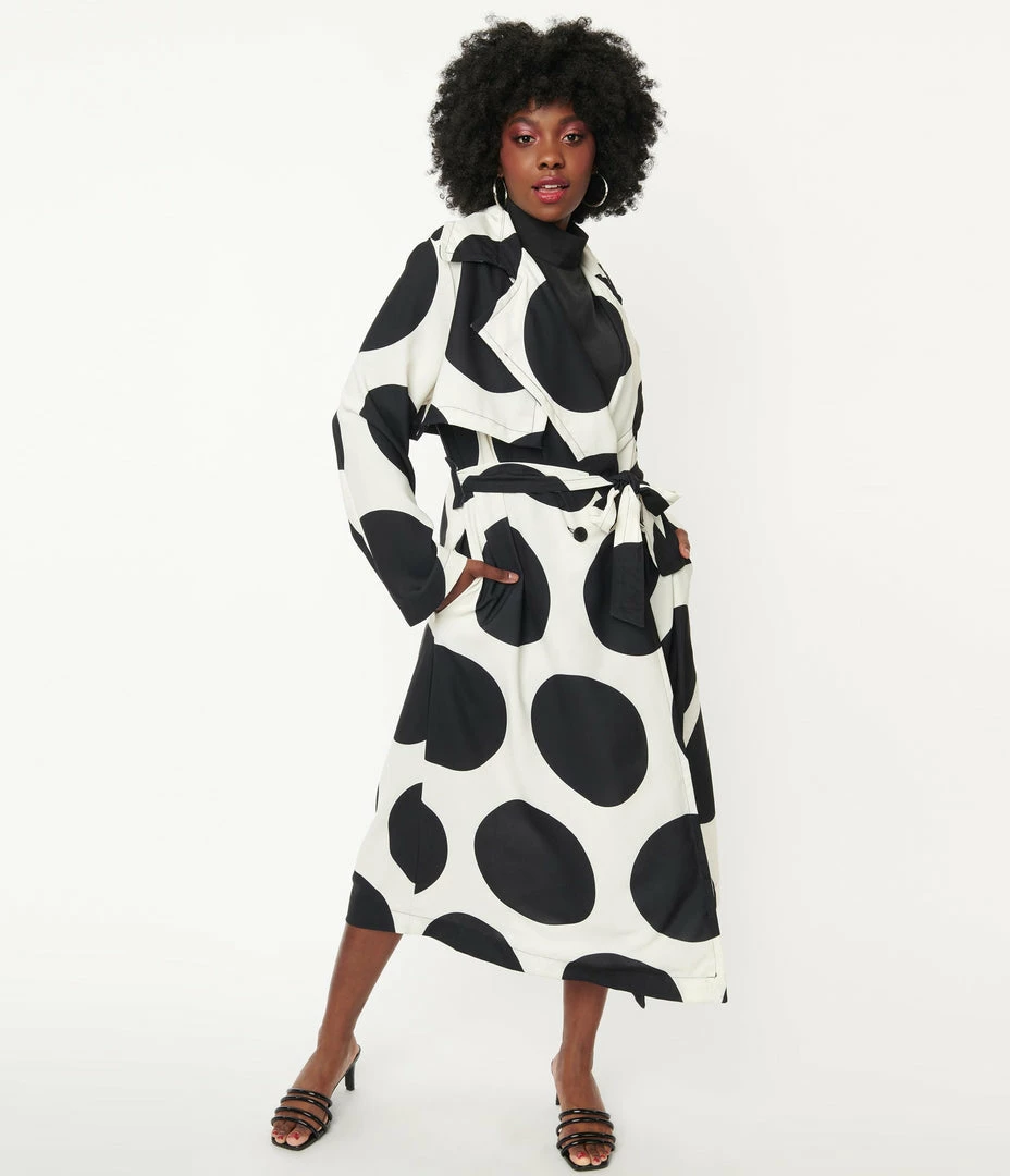 Calculated cute, dears! A fabulous addition to your workwear, this crisp and lightweight long jacket is dazzling with large black polka dots dancing throughout the ivory white backdrop. Crafted in a lightweight woven fabric, the notched lapel frames the open V-neckline while a double breasted button up front lends retro elegance. Framed by long sleeves a matching sash nips in your feminine form while the elongated silhouette is outfitted with side pockets for styling comfort from work to happy hour!