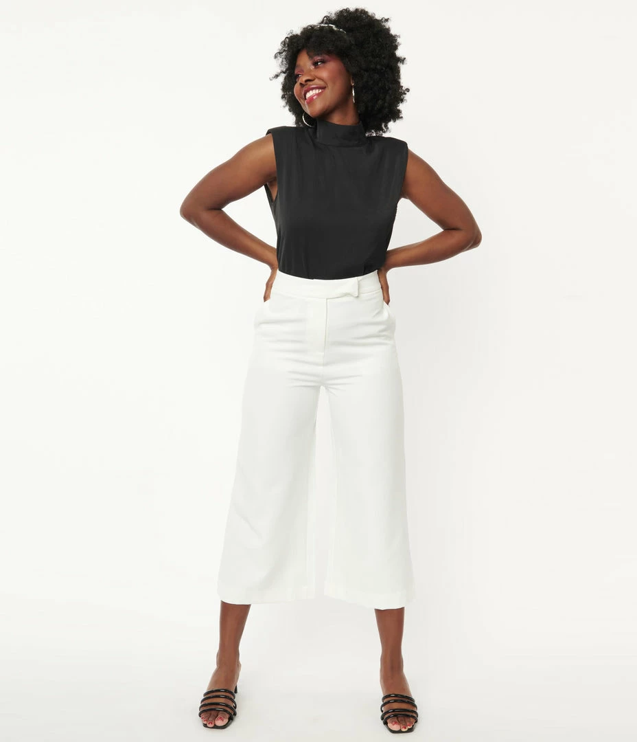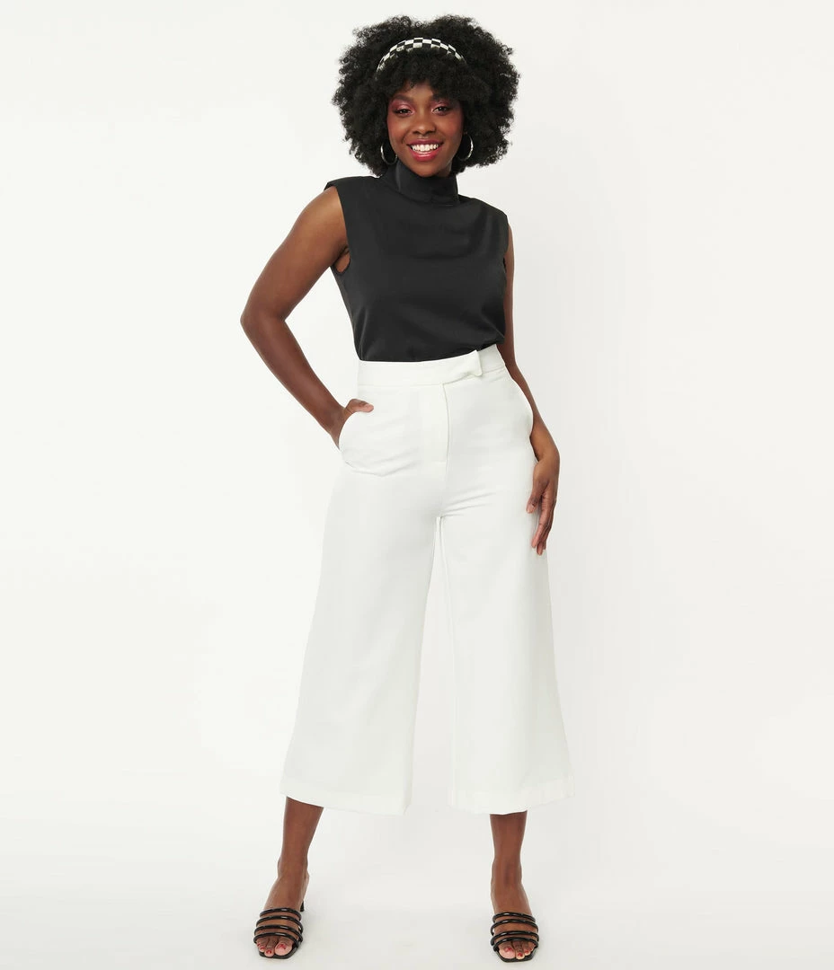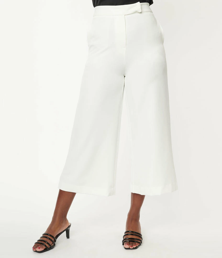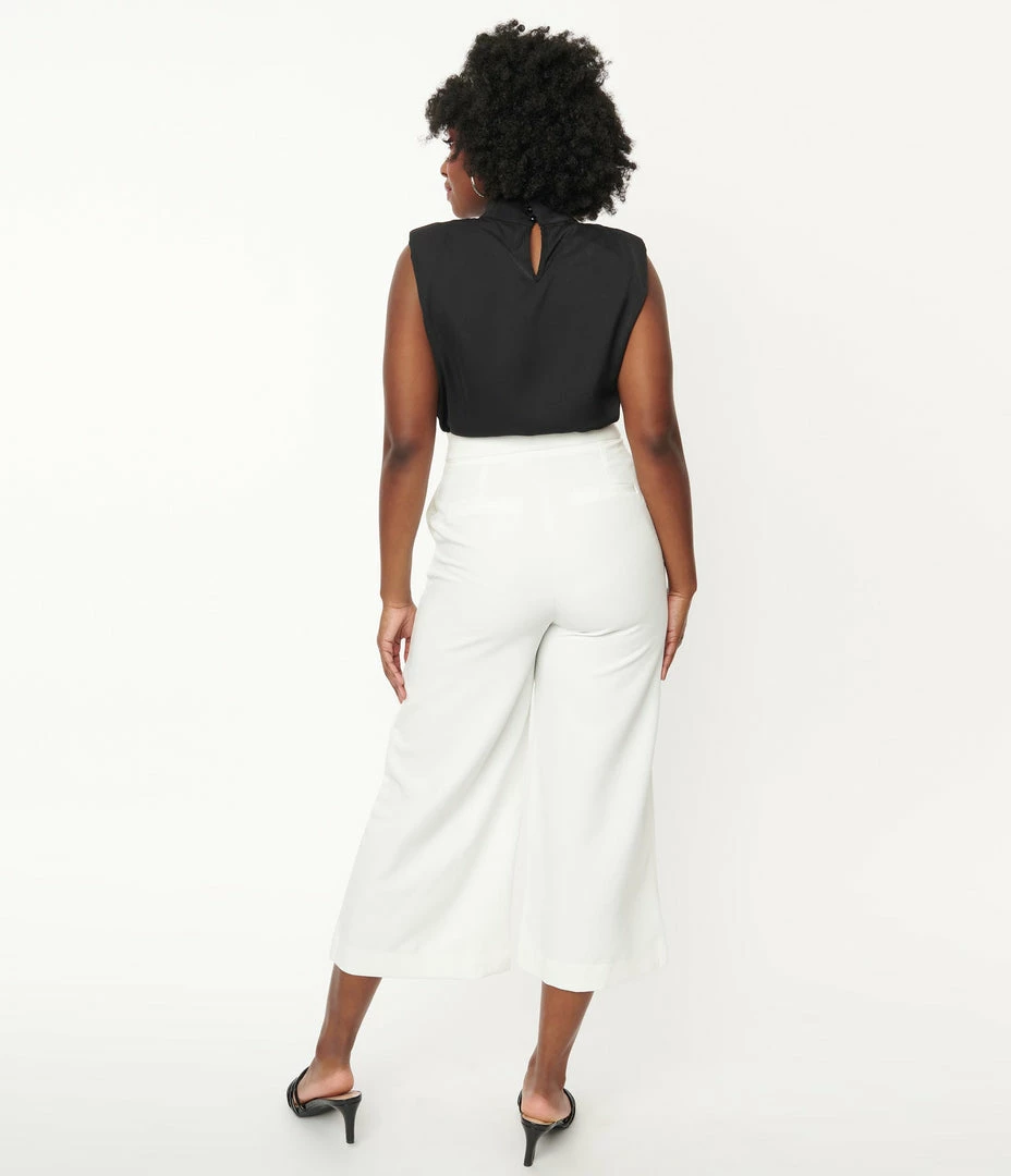 Your poses are on point, darling! A feminine, retro inspired separate in a ivory lightweight woven crepe. These culottes boast a banded high waist cinched by the front zipper and button, while the fabulous wide legs for retro flair. Complete with side pockets for a modern touch!